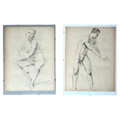 Pair Mid-Century Nude Man & Woman Drawings