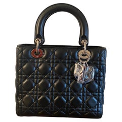 Lady D Dior black leather bag with silver hardware. In perfect condition, only a few minor signs of use on the inside of the handles. Red interior with a side pocket closed with a zi...