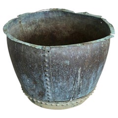 An enormous copper cauldron from England, mid to late 19th century, the metal plates riveted together and now oxidized to beautiful turquoise verdigris patina splashing the dark meta...
