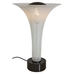 White filigree Murano glass table lamp in the shape of a calla lily with partial black round top cover that causes the light to diffuse mainly through the glass. Designed by Carlo Na...