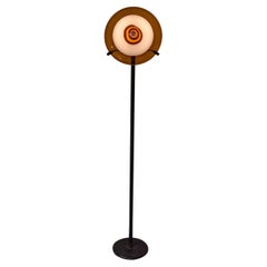 Floor lamp composed of slender metal stem and circular base, and 40 cm diameter circular diffuser made of orange and milky white smoked Murano glass with colored murrina in the cente...