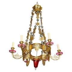 Fine gilt bronze chandelier in the French Louis XV style with 12 electrified candles and dozens of crystal glass pendants including pendeloques, octagon chains, spheres and spires. ...