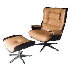 Midcentury Modern Design Leather Lounge Chair & Ottoman, Germany 1960's