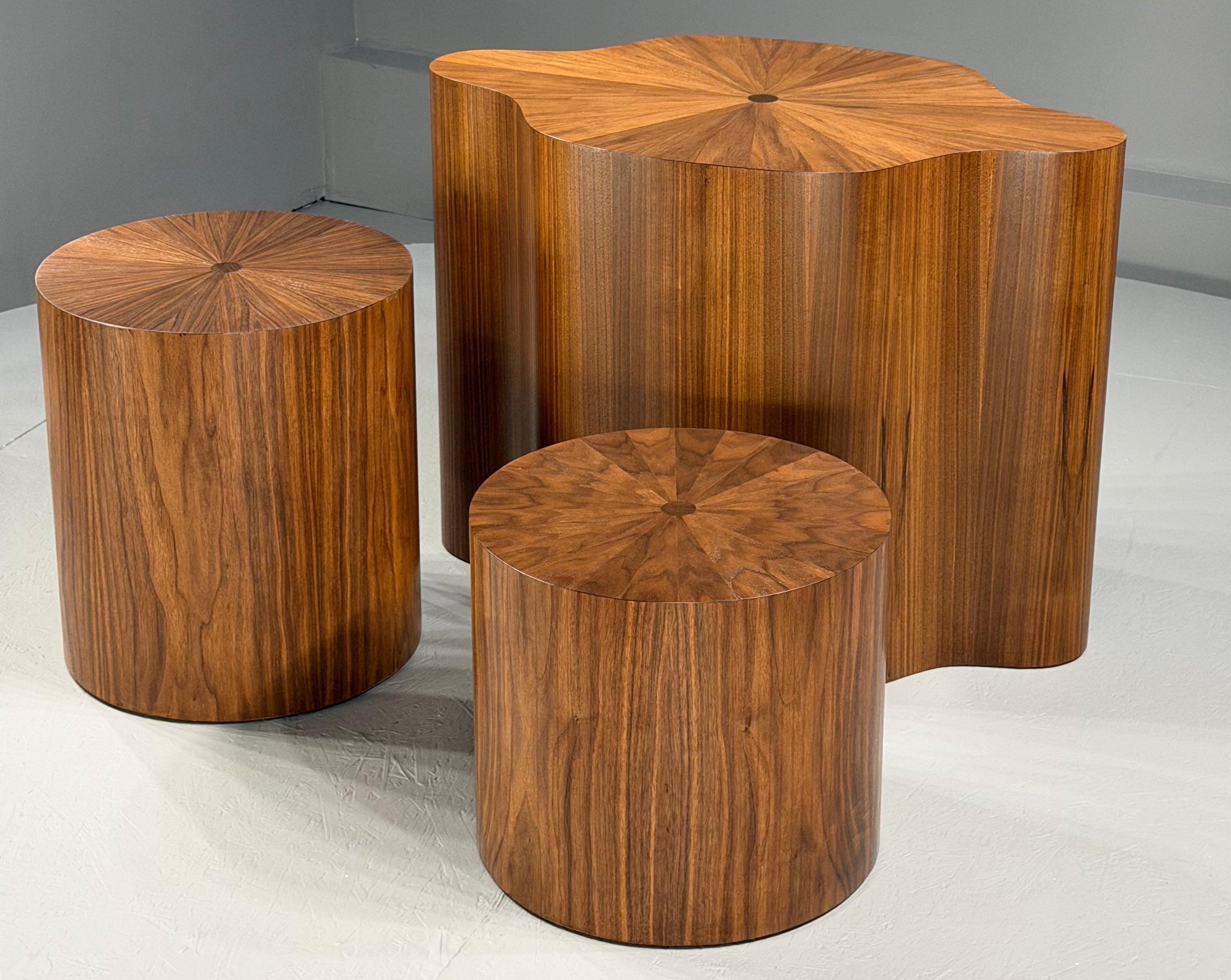 A collection of bases built by Aaron Saxton from coffee table, end table and dining table heights. Use without glass, or use with glass to create larger tables while preserving ingredients the radial appearance of the tops.