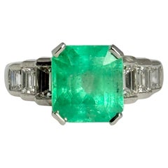 The Step cut Octagonal Emerald in this ring is a natural, non heat treated Columbian stone and measures 3.41ct. It is the most stunning green colour. Either side sits a trio of diamo...