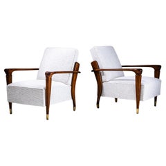 Pair of lounge chairs with elegantly curved armrests and brass sabots. The wooden walnut frames have been meticulously polished, and the seats newly upholstered in a high-quality whi...
