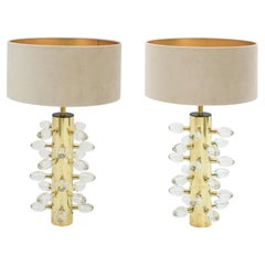 Pair of contemporary table lamps. Cylindrical structure made of brass with pieces of transparent Murano glass. Shades upholstered with beige cotton velvet. Italian manufacture.