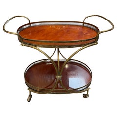 Elegant Italian bar cart from the 1950s featuring two lacquered oval tiers framed by pierced brass galleries. The warm, high-gloss surfaces contrast beautifully with the patinated br...