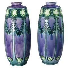 Pair of Minton Secessionist No.1 vases of stretched barrel-like forms. The purple ground is decorated in blue and white slip-trailing, with green tube-lined outlines. Maker's marks t...