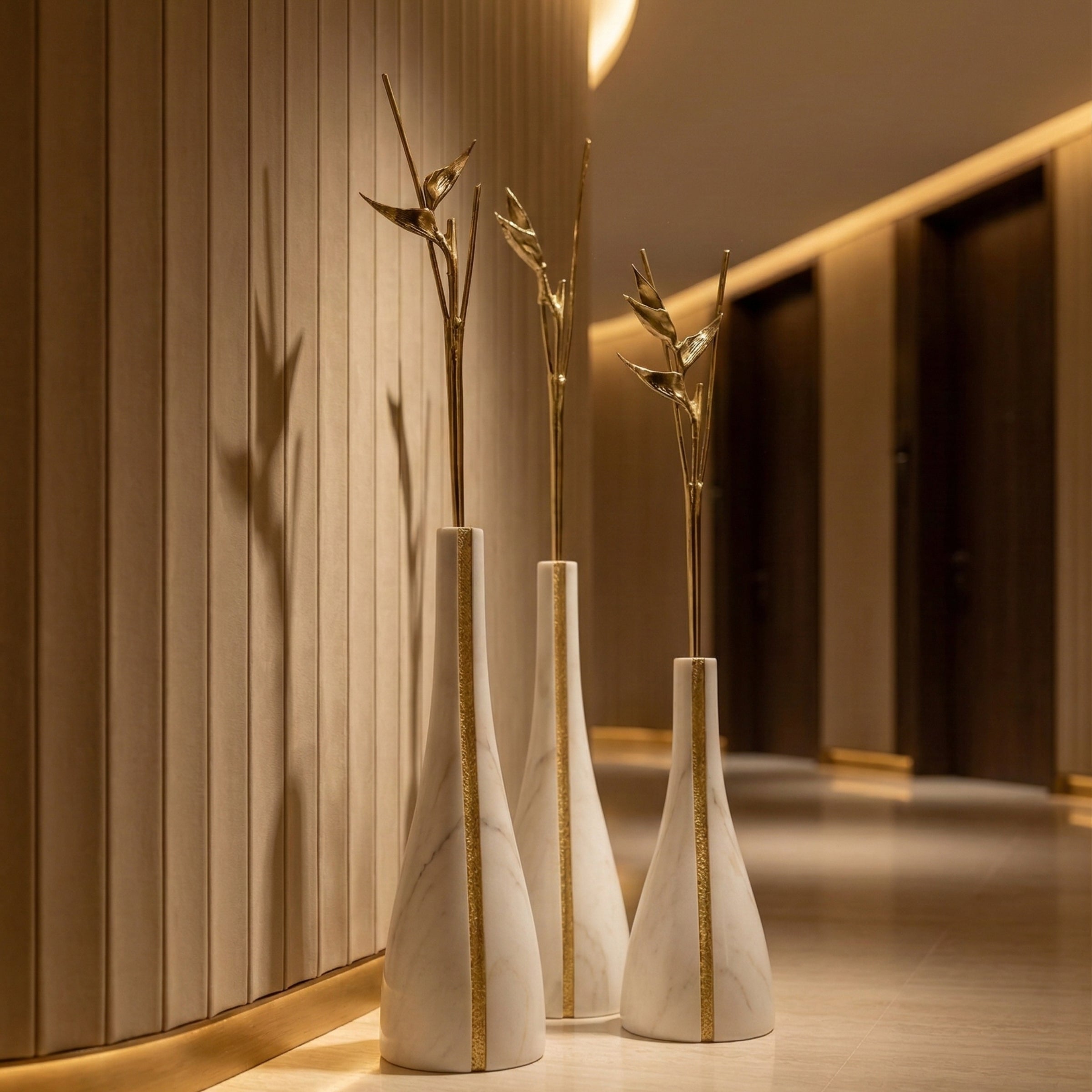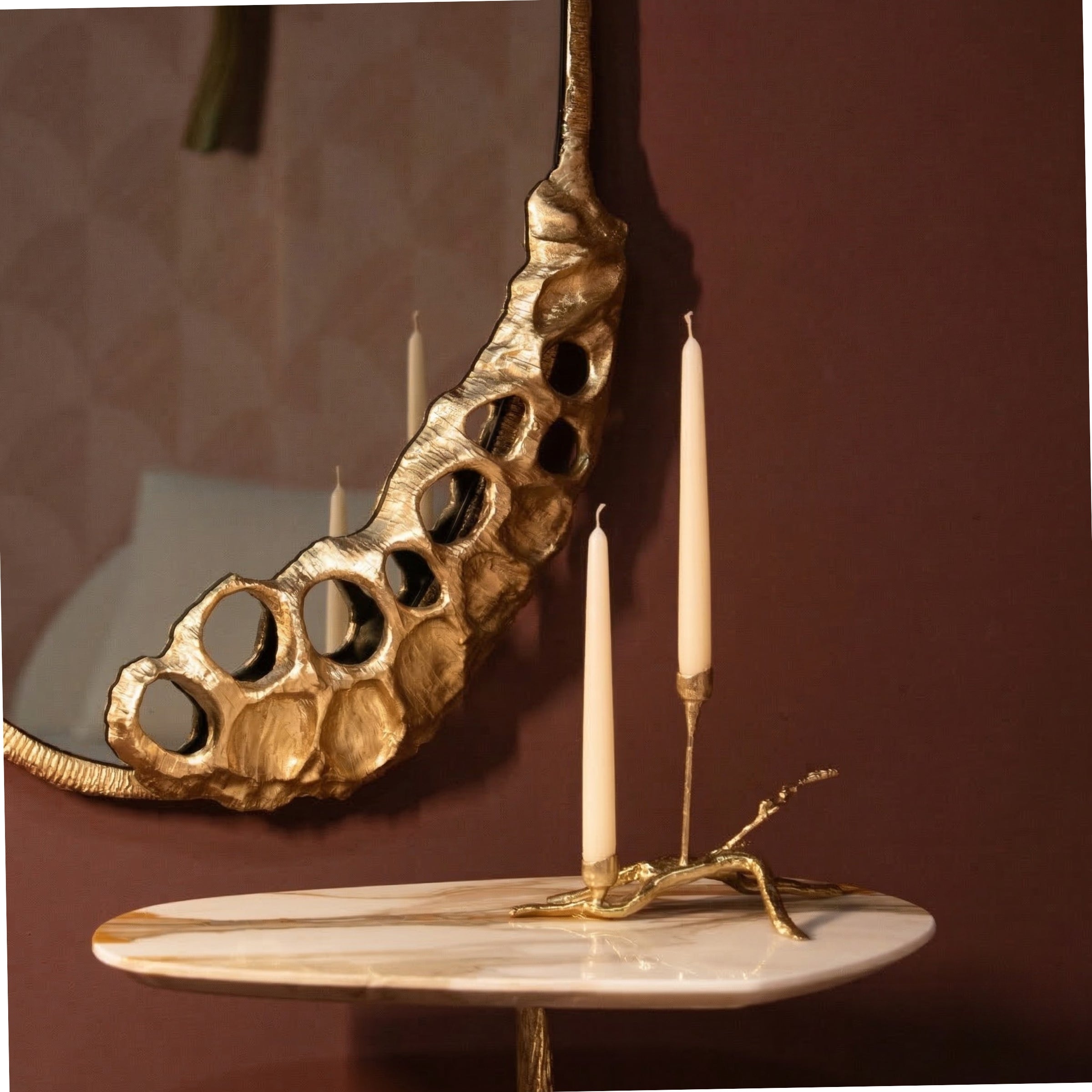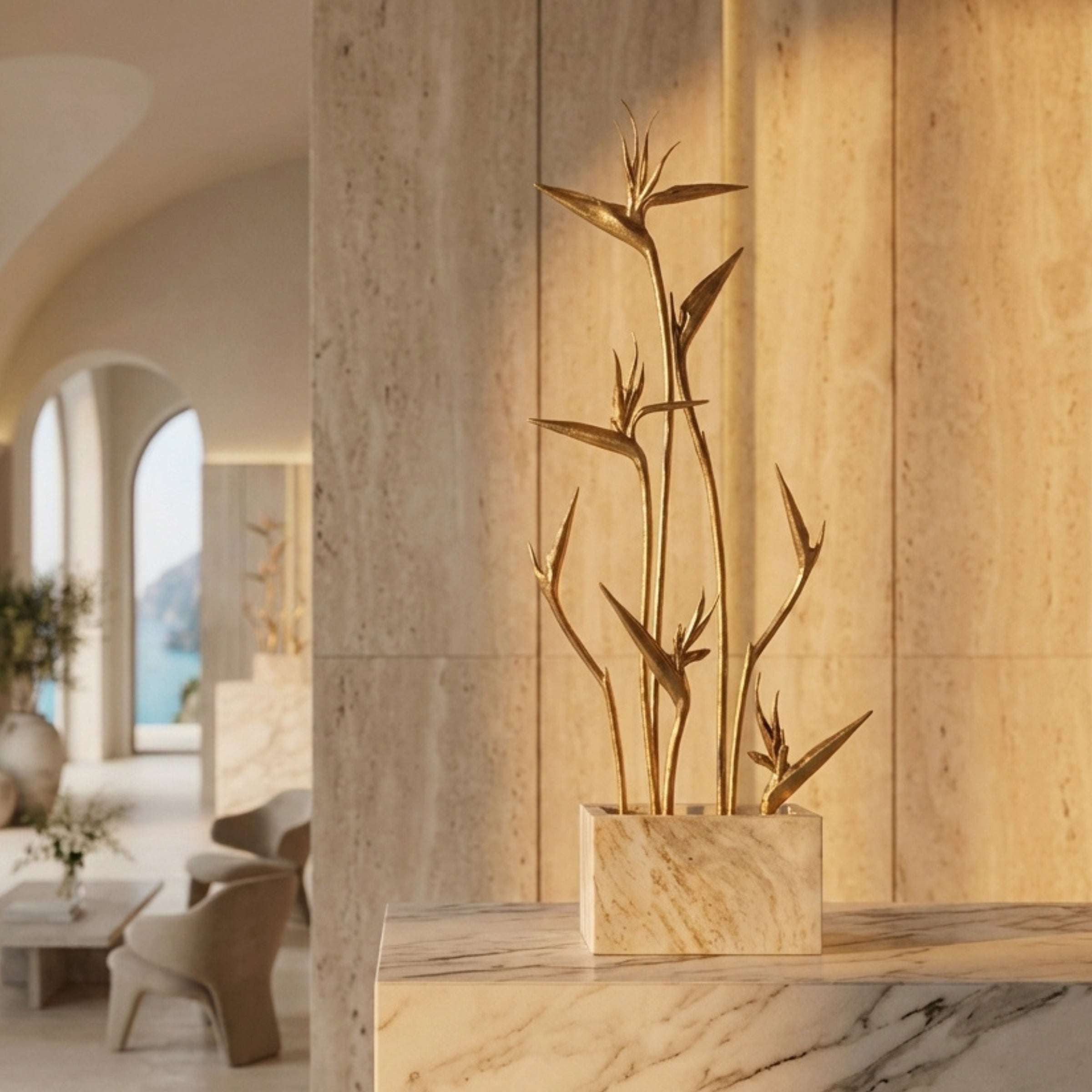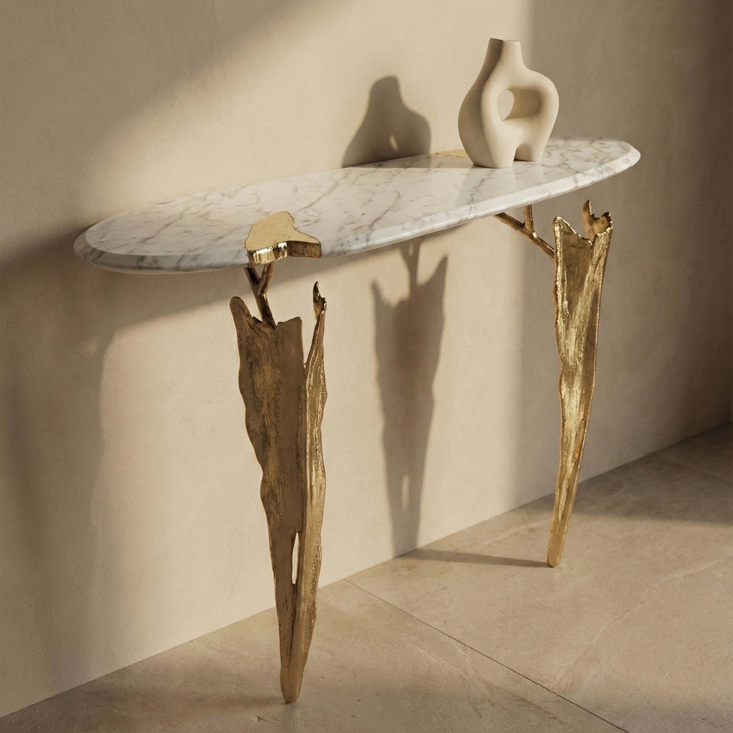 Folia Console, sculptural brass unfolds in botanical curves beneath polished marble. Handcrafted in Oporto, each curve shaped and finished by hand. A collectible piece of functional art, conceived to be lived with and passed on.