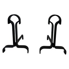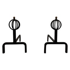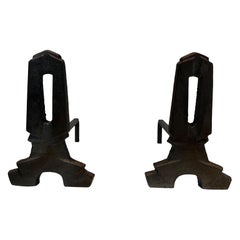 Pair of modernist cast iron and wrought iron andirons. French work. Circa 1940