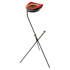 A refined French ashtray, defined by its elegant tripod base and beautifully suspended ceramic bowl. The slender black metal structure is accented by sculptural brass-tone finials, c...