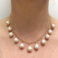 Lustrous, large white freshwater pearl drops, each adorned with a faceted gold bead, gently dangle from a textured open link chain, creating a necklace of effortless eleg...