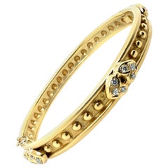 This Retro-era bangle bracelet is crafted in 18K yellow gold and weighs 34.9 grams, offering a substantial yet elegant feel on the wrist. The bangle measures approximate 6.5 inches a...