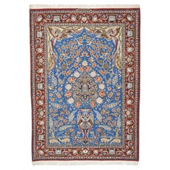 Fine Isfahan rug woven in Persia around 2000, featuring an elegant pictorial design with birds, flowering trees, and delicate floral branches set on a vibrant blue field. The composi...