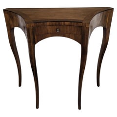 Very elegant and refined Italian Mid-Century Modern design squared demi lune console side table. Standing on four typically shaped wooden legs with the top decorated by the wooden ve...