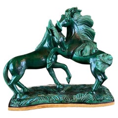 Large green glazed ceramic sculpture representing two rearing horses, signed R. Prunet. French ...
