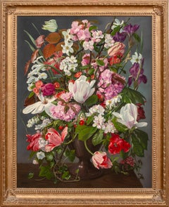 Large 19th century English Still Life of various summer flowers in a vase, oil on canva...