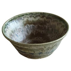 A handmade, stoneware bowl with decorative slipware design. Likely made in Denmark during the late 20th century.