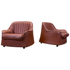 A pair of patinated leather 'Ciprea' lounge chairs on casters designed by Afra and Tobia Scarpa for Cassina in 1968.