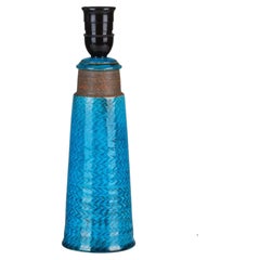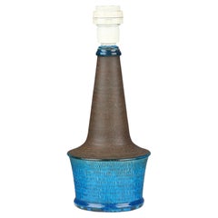 Table lamp made of partly blue-glazed stoneware with relief pattern. Signed “HAK Nils” and stamped “Made in Denmark” on the bottom.
