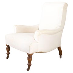 This is a very elegant 19th century English country house armchair. High quality and extremely comfortable. Lovely turned legs all complete with original casters. Back legs has a num...