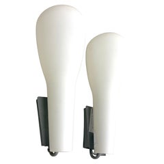 An Elegant Pair of Italian Mid-Century Organic Modern Satin Milk Glass Wall Sconces attributed to Max Ingrand and Fontana Arte circa 1960. The pieces have a rare, sublime form and li...