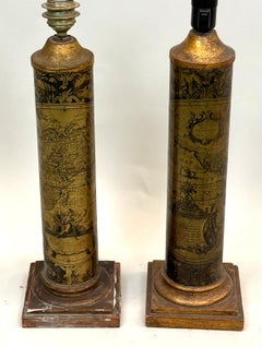 An Elegant Pair of Italian Mid-Century Modern Table Lamps in Style of Piero Fornasetti, circa 1950. The lamps have a pure cylindrical form and are composed of screen printed metal fe...