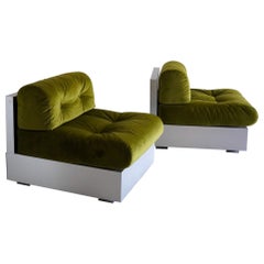 Pair of modernist lounge chairs by Saporiti, Italy 1970s clad in brushed aluminum and newly upholstered in soft, olive green velvet. Lucite feet give a floating appearance to the des...