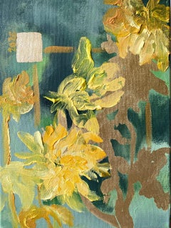 Este gran cuadro especial de pan de oro sobre lienzo al óleo creado por Shizico a principios de otoño, en el que florecen las Dalias y el color de las hojas que se vuelven toman el p...
