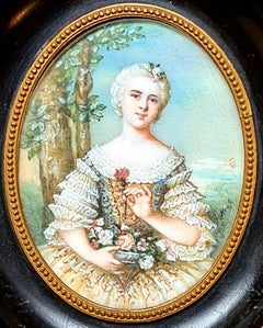 Retrato en miniatura, francés, siglo XIX de una bella dama, óleo sobre vitela sobre cartulina. La miniatura no está firmada, pero es de muy buena calidad. Presentado en un marco de m...