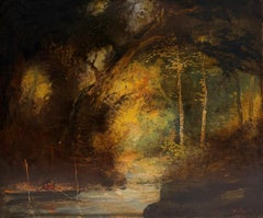 Antiguo óleo francés sobre madera con paisaje fluvial en marco dorado de Antoine Guy