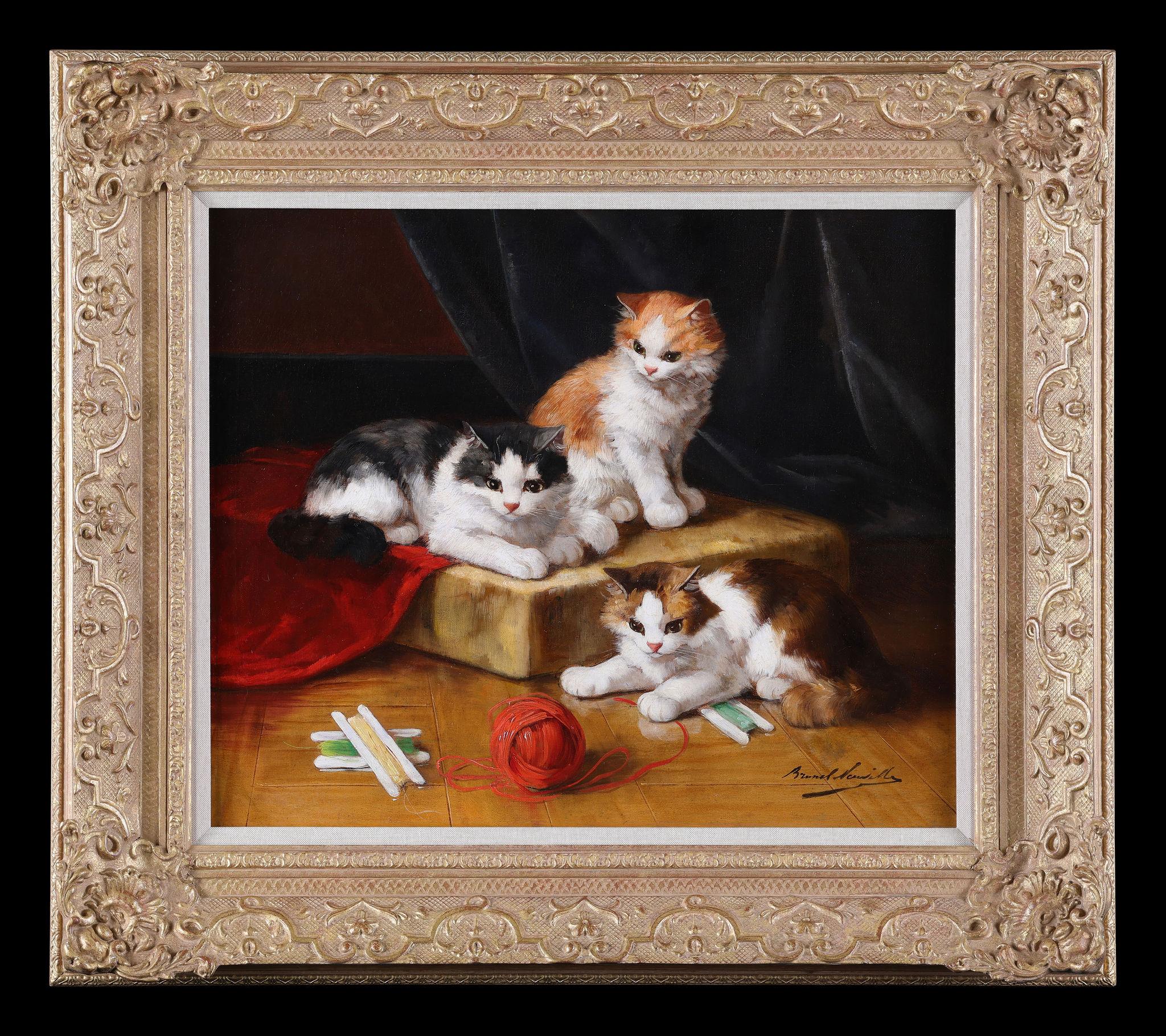 Pintura antigua sobre gatos "Gato con mariposa en un prado" Arthur Heyer 1872-1931