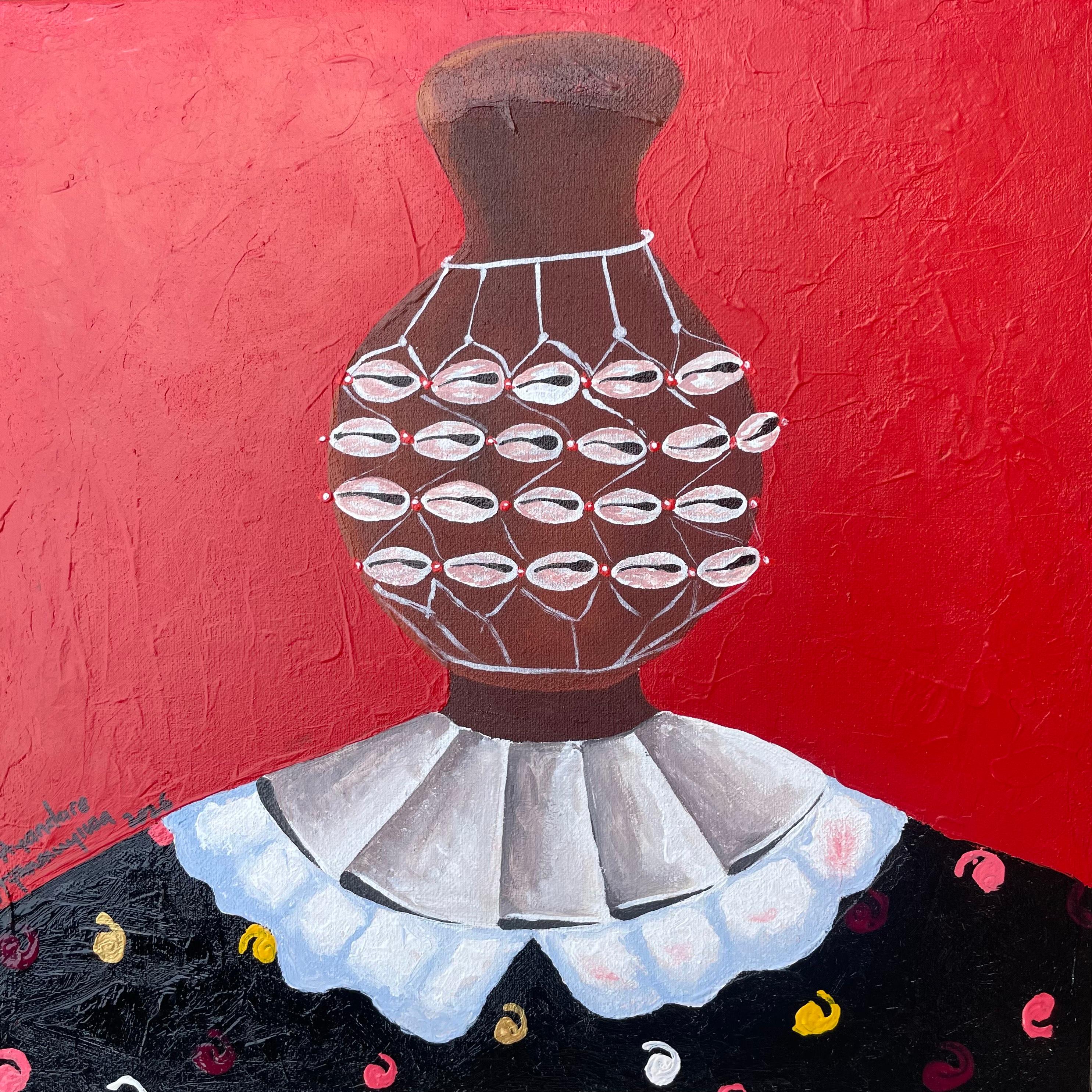 Alegre jarra de jengibre en una habitación colorida, esta pieza se inspira un poco en Matisse con la pared a rayas y el estampado orgánico del jarrón. Pintada en acrílico sobre un li...