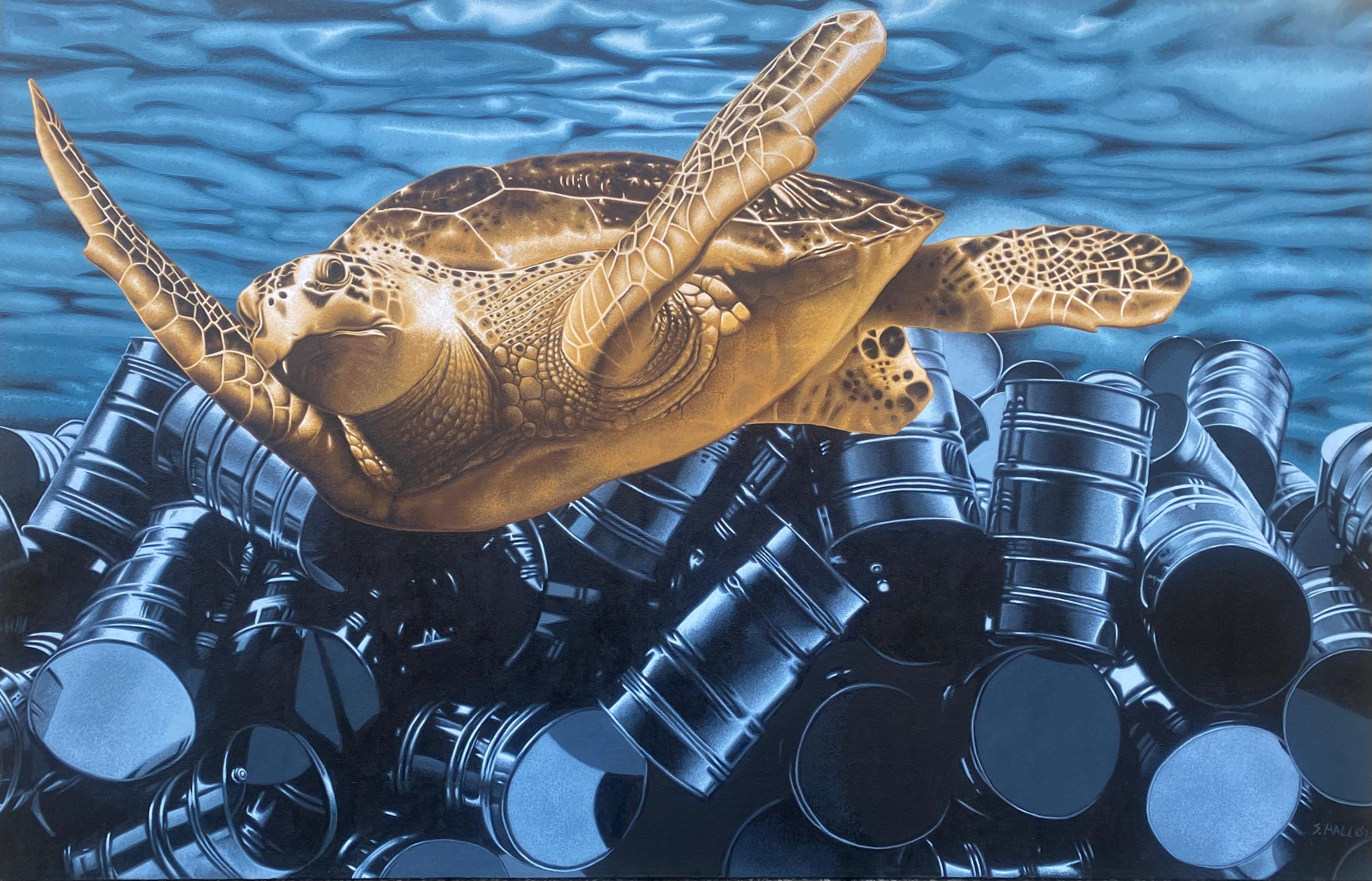 El cuadro está realizado con una técnica mixta utilizando pan de oro. La imagen central de la composición es una tortuga marina, símbolo de armonía, sabiduría y tranquilidad. El cap...