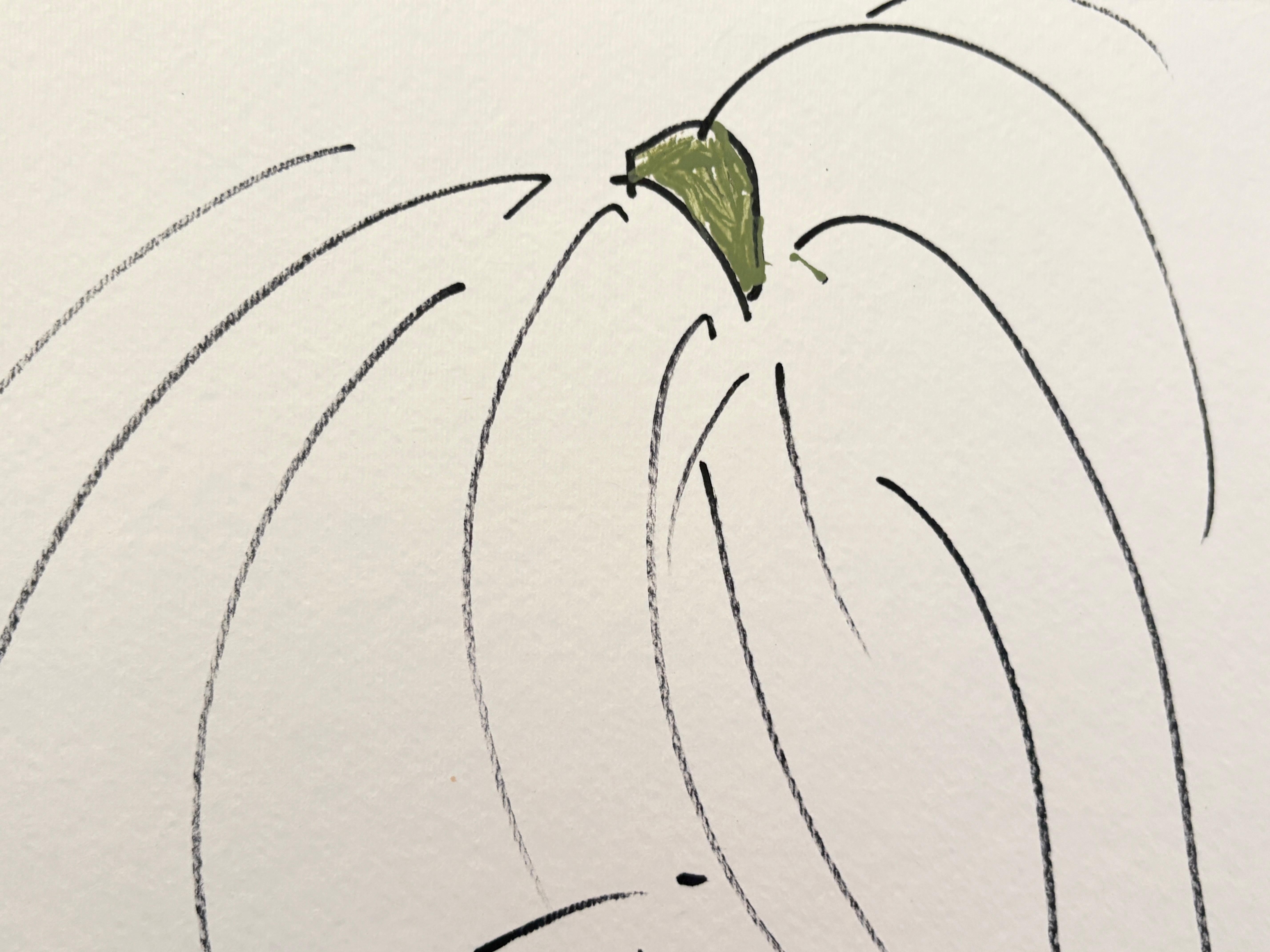 En este dibujo íntimo, Sylvia Spicuzza presenta al espectador a una joven agachada en un jardín. La imagen está enmarcada por follaje y campos de color.