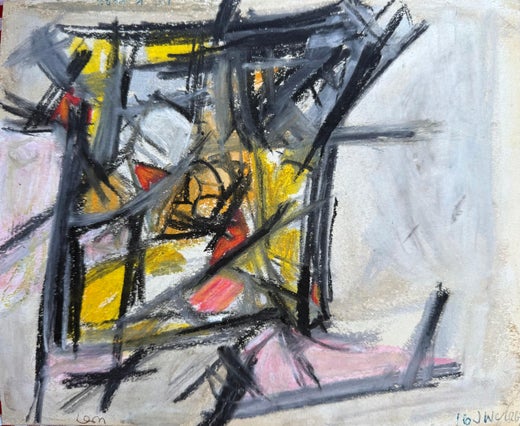 Pastel al óleo y gouache originales sobre papel de archivo del conocido artista estadounidense Leon Wall. Firmado con las iniciales del artista abajo a la derecha. Fechado en 1959 en el margen inferior izquierdo. Su estado es bueno. Actualmente sin enmarcar. Procedencia: Un coleccionista de Long Island, Nueva York.