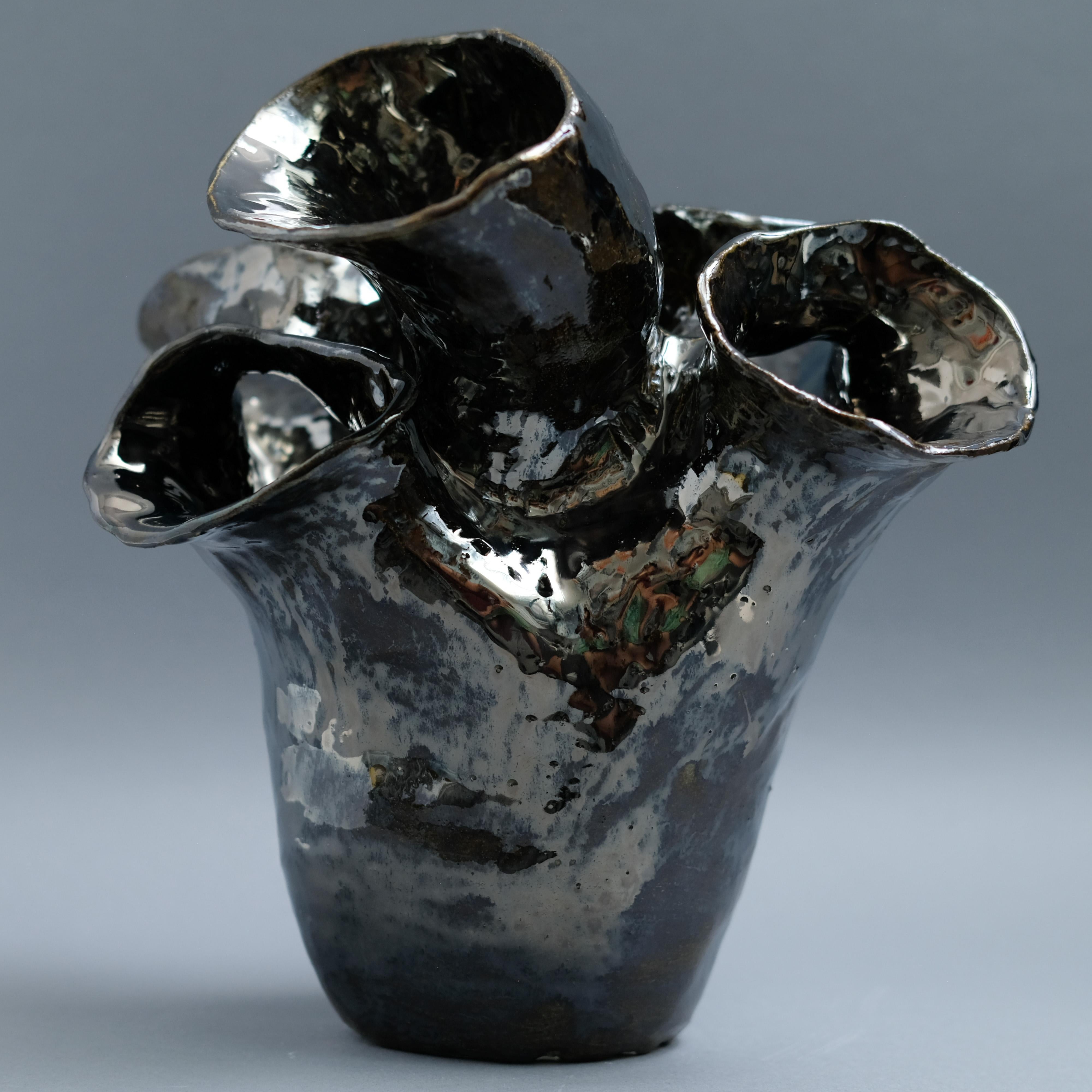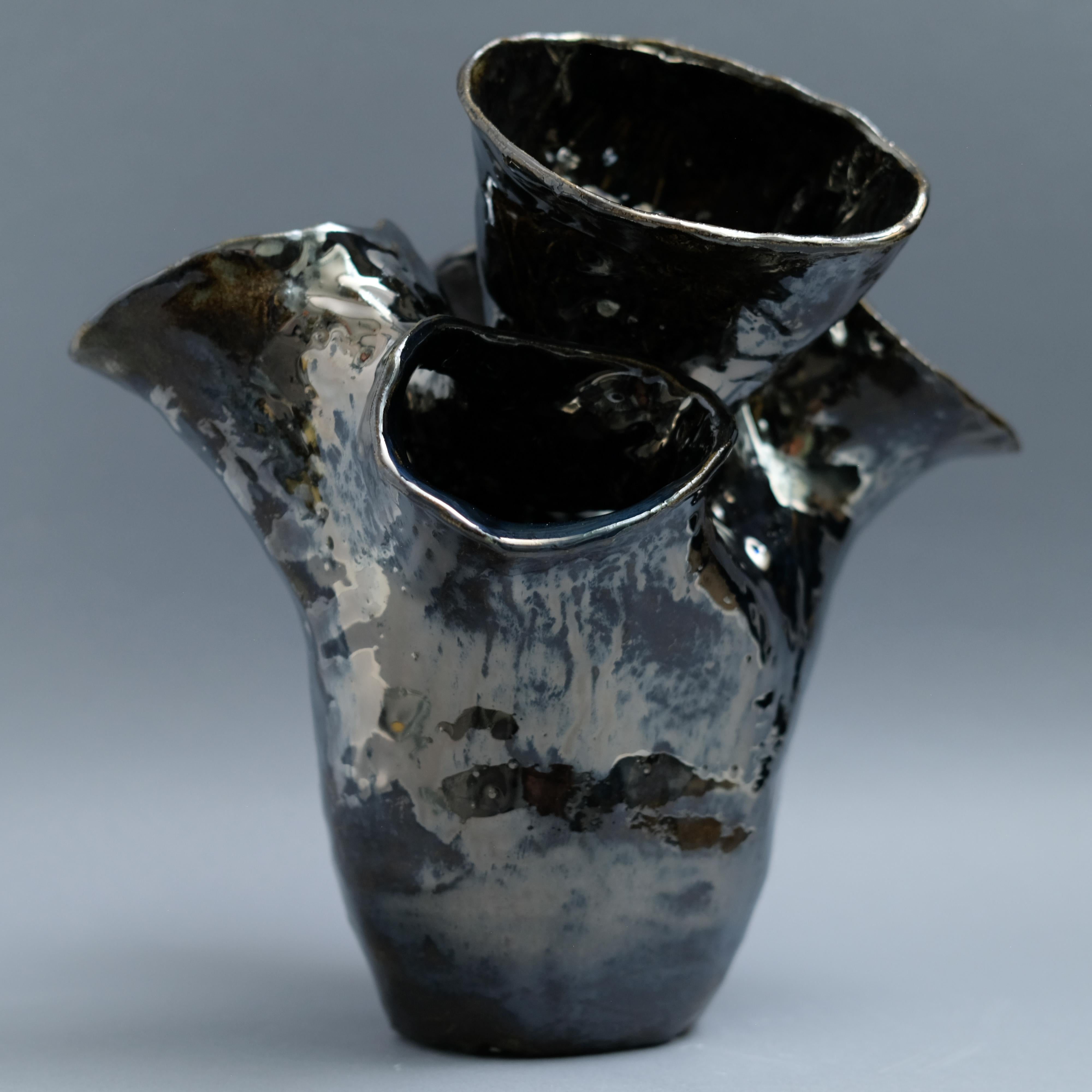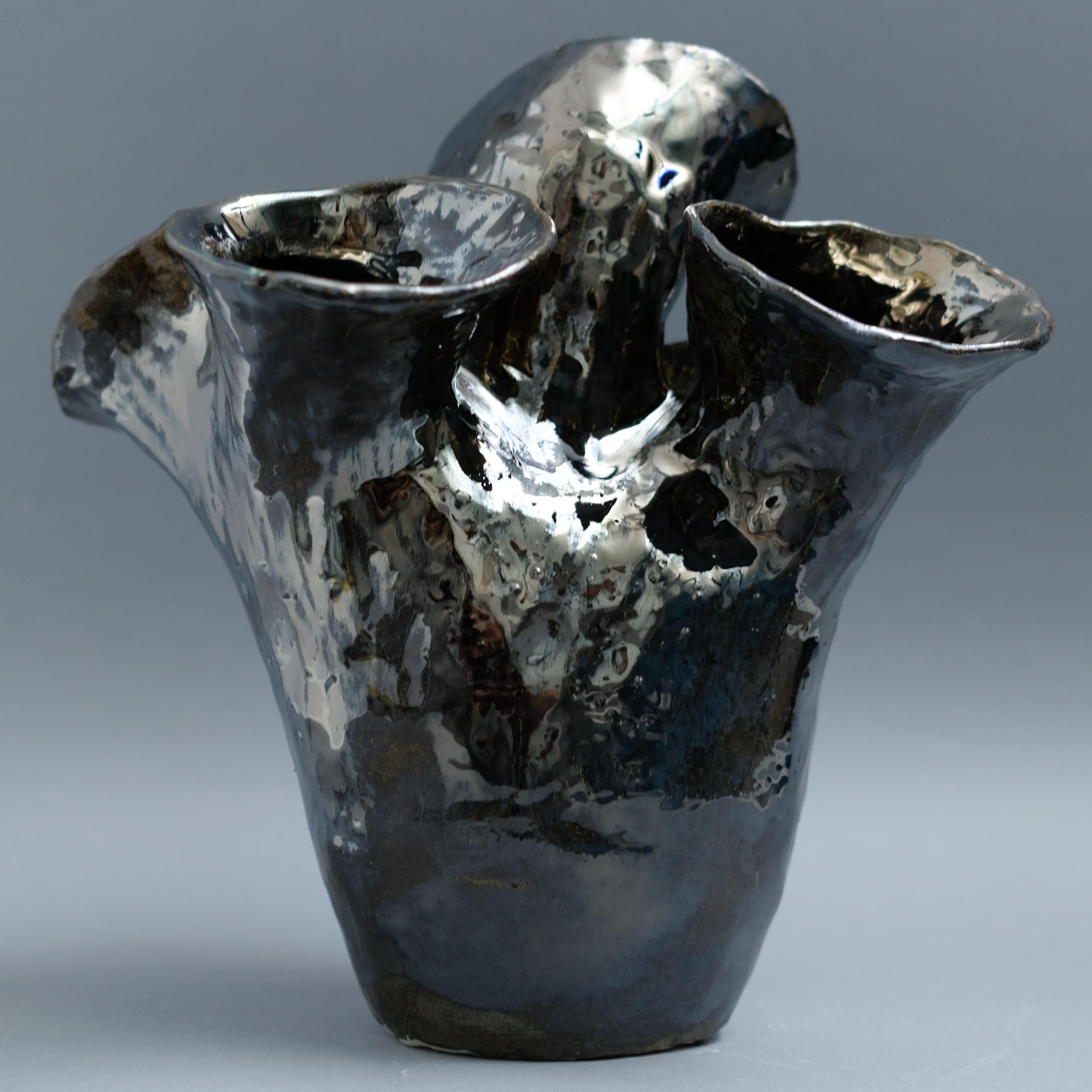 Vaso escultura de cerámica esmaltada cromada metálica, hecho a mano por Jessamyn Go.