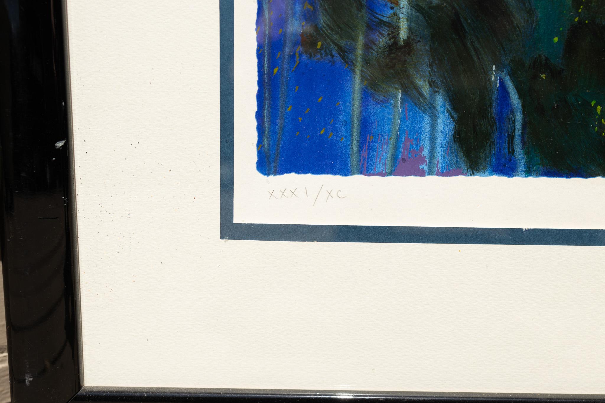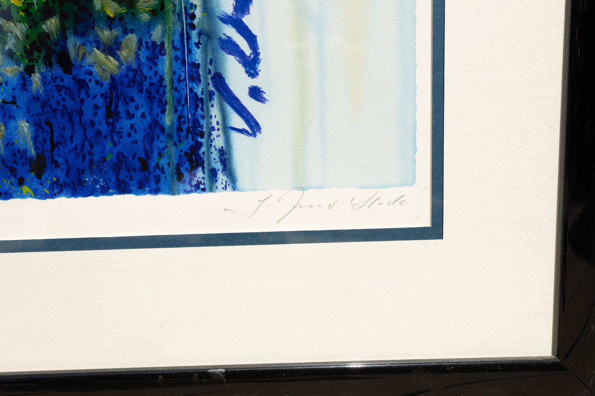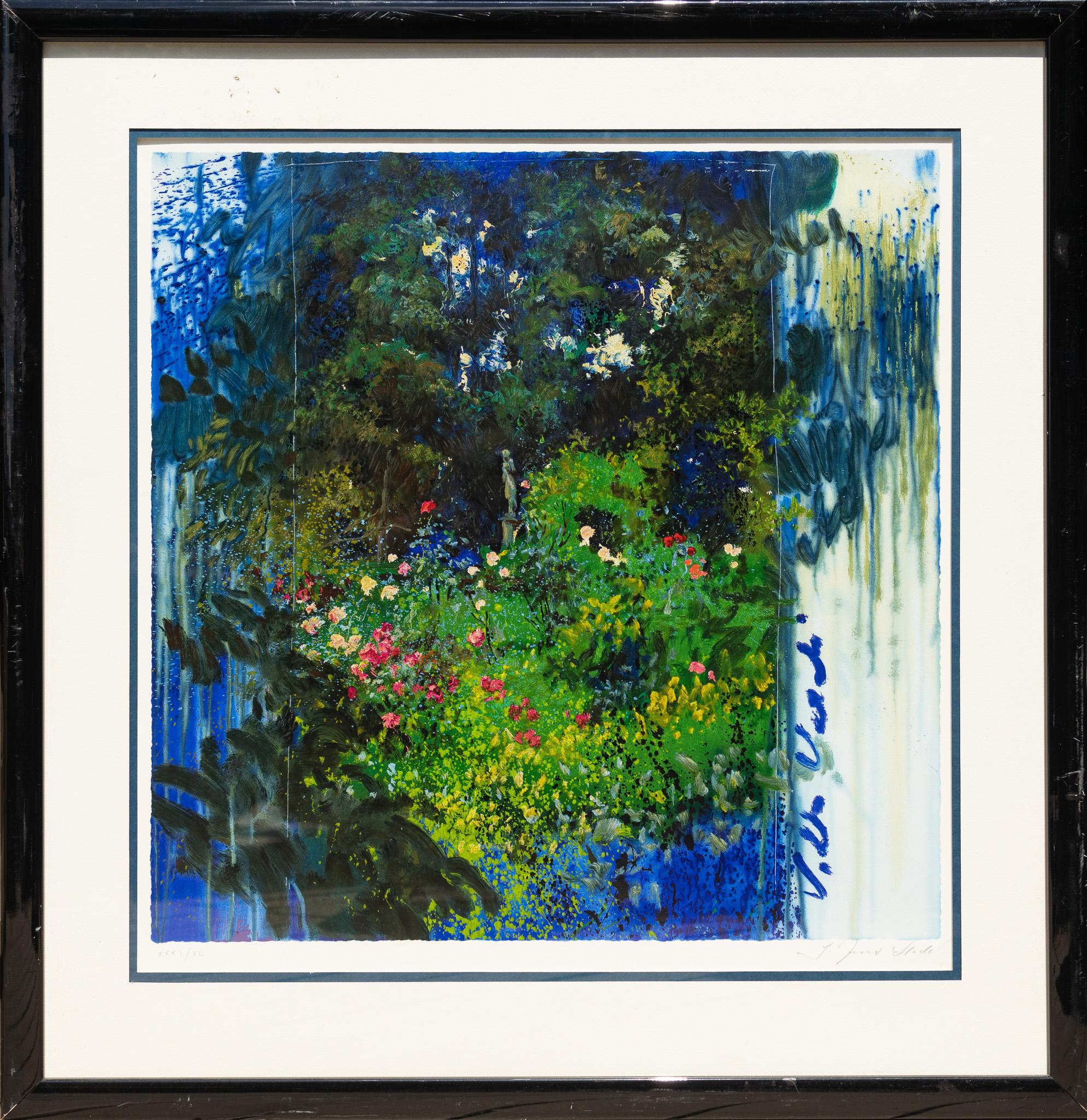 Esta serigrafía hecha a mano muestra una escena de jardín alegre, enérgica y exuberante, con una cualidad expresiva, activa y abstracta. La obra se centra en una profusión de rosales representados con pinceladas de rojo, rosa y amarillo brillantes. El ojo es atraído hacia la fresca sombra de la copa de los árboles que hay encima, que presenta trazos brillantes y moteados que representan haces de luz que penetran en la sombra. Una distante estatua de figura clásica se alza sutilmente en medio del verdor, ofreciendo un momento de misterio y calma dentro de la caótica floración. El cuadro está enmarcado por amplias marcas gestuales de azul intenso y vetas de pigmento diluido que se derraman por los bordes, sobre todo a la derecha, donde los goteos verticales de verde y azul crean un llamativo contraste contra el fondo de papel blanco. El intenso uso del color y la variada pincelada dan la impresión general de un jardín visto a través de una lluvia enérgica y brillante, o de una bruma emocional.