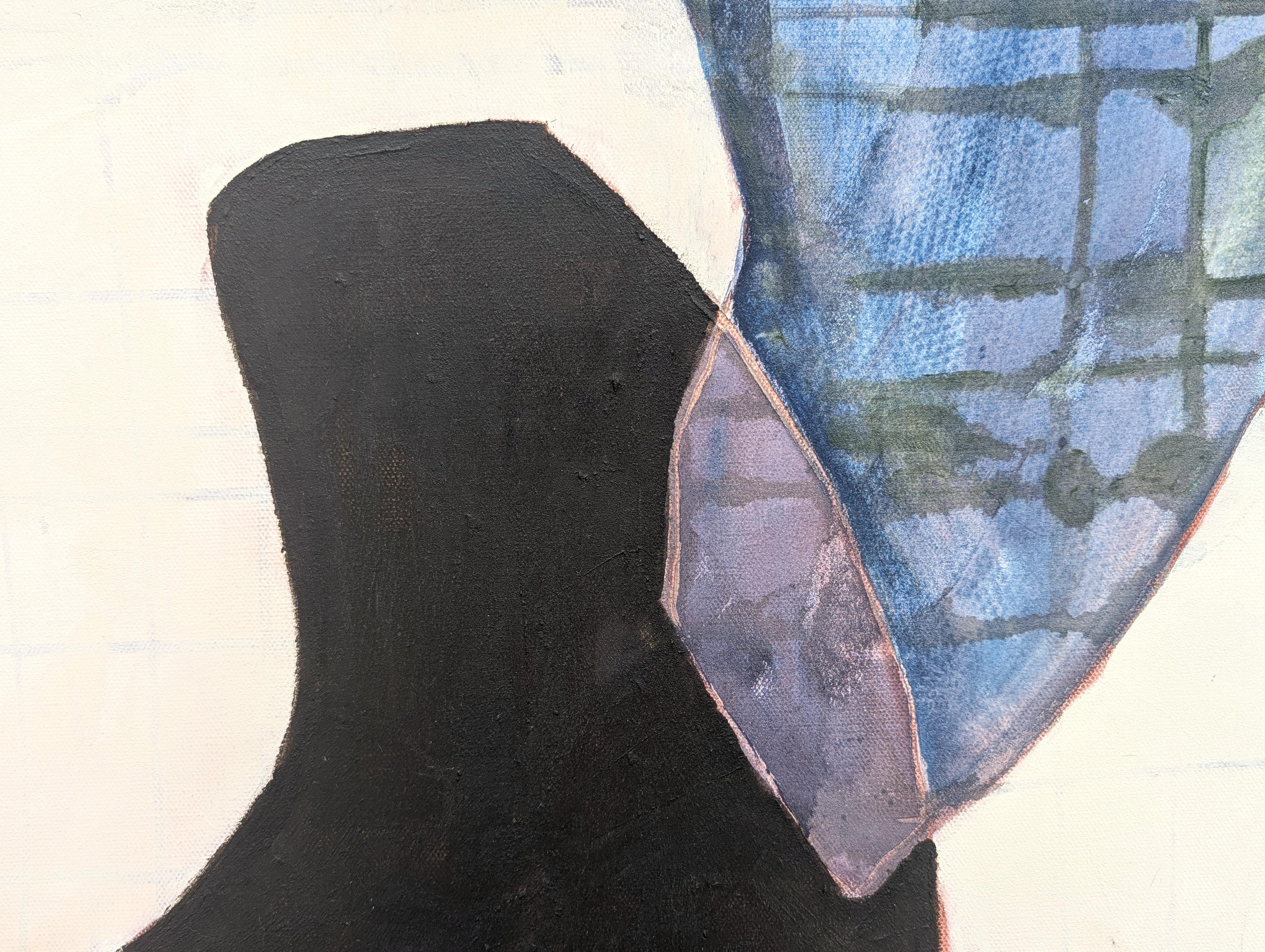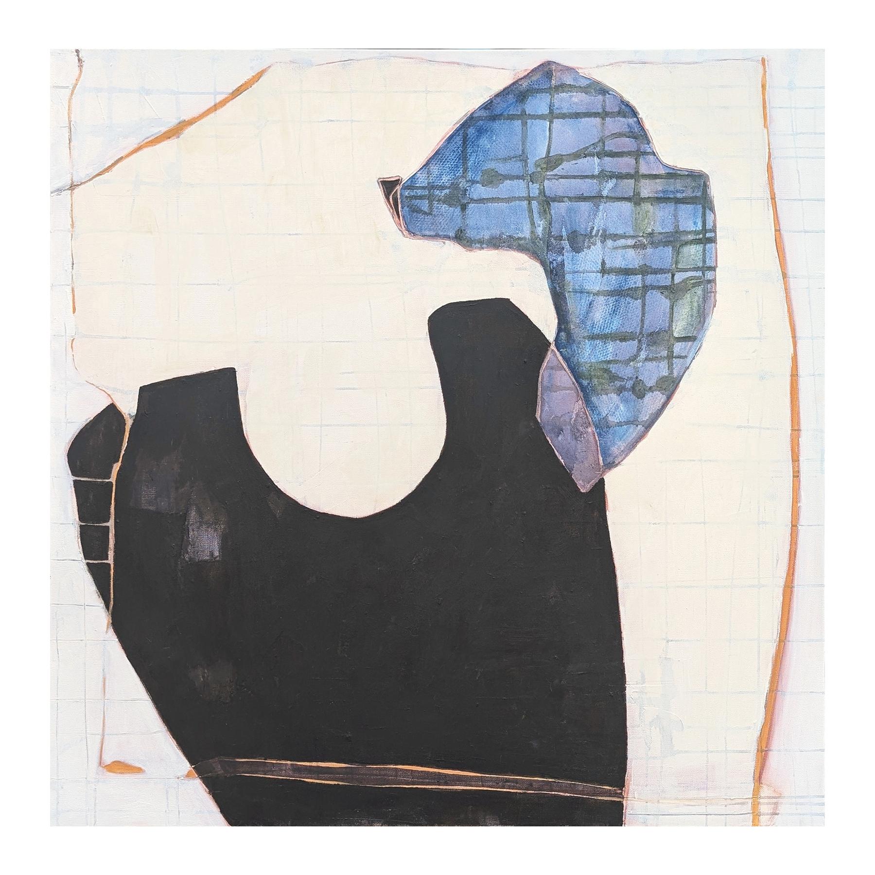 Pintura abstracta contemporánea en tonos neutros de la artista afincada en Houston Kristen Anton. La obra presenta formas abstractas negras y azules que flotan sobre un campo de color hueso. Firmado, titulado y fechado en el reverso. Actualmente sin enmarcar, pero hay opciones disponibles.