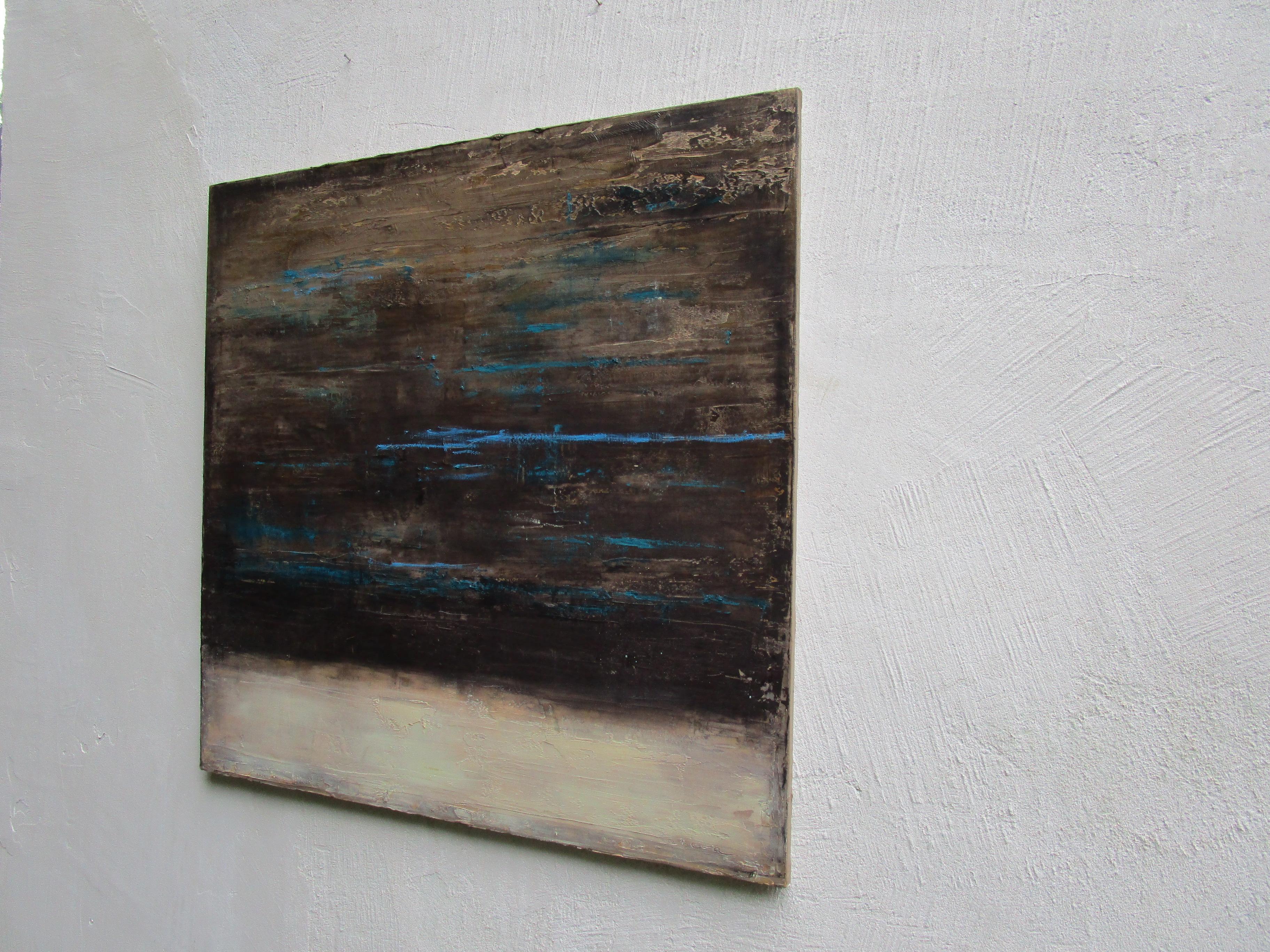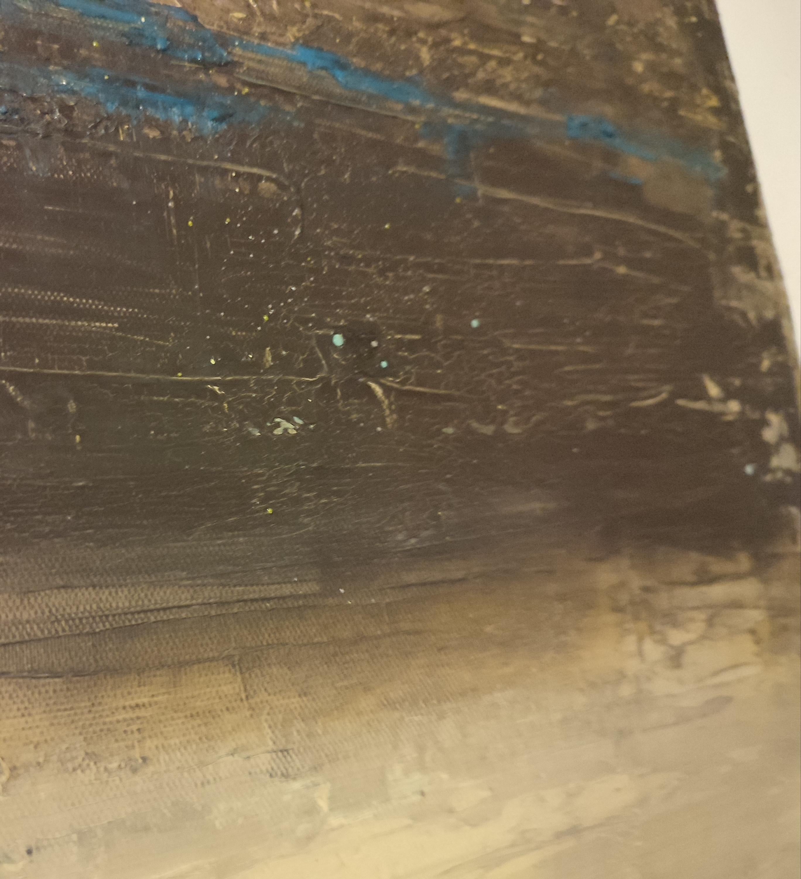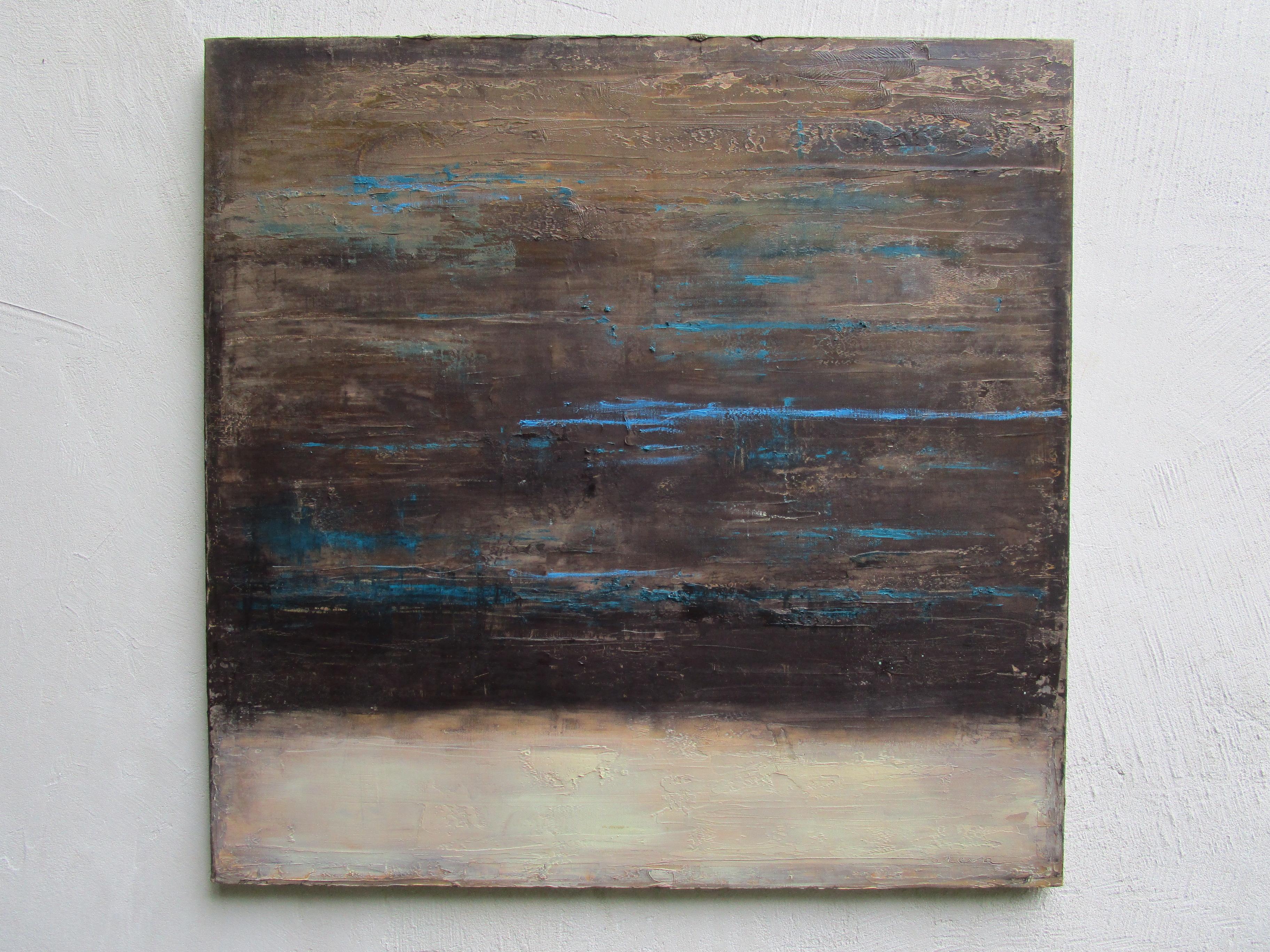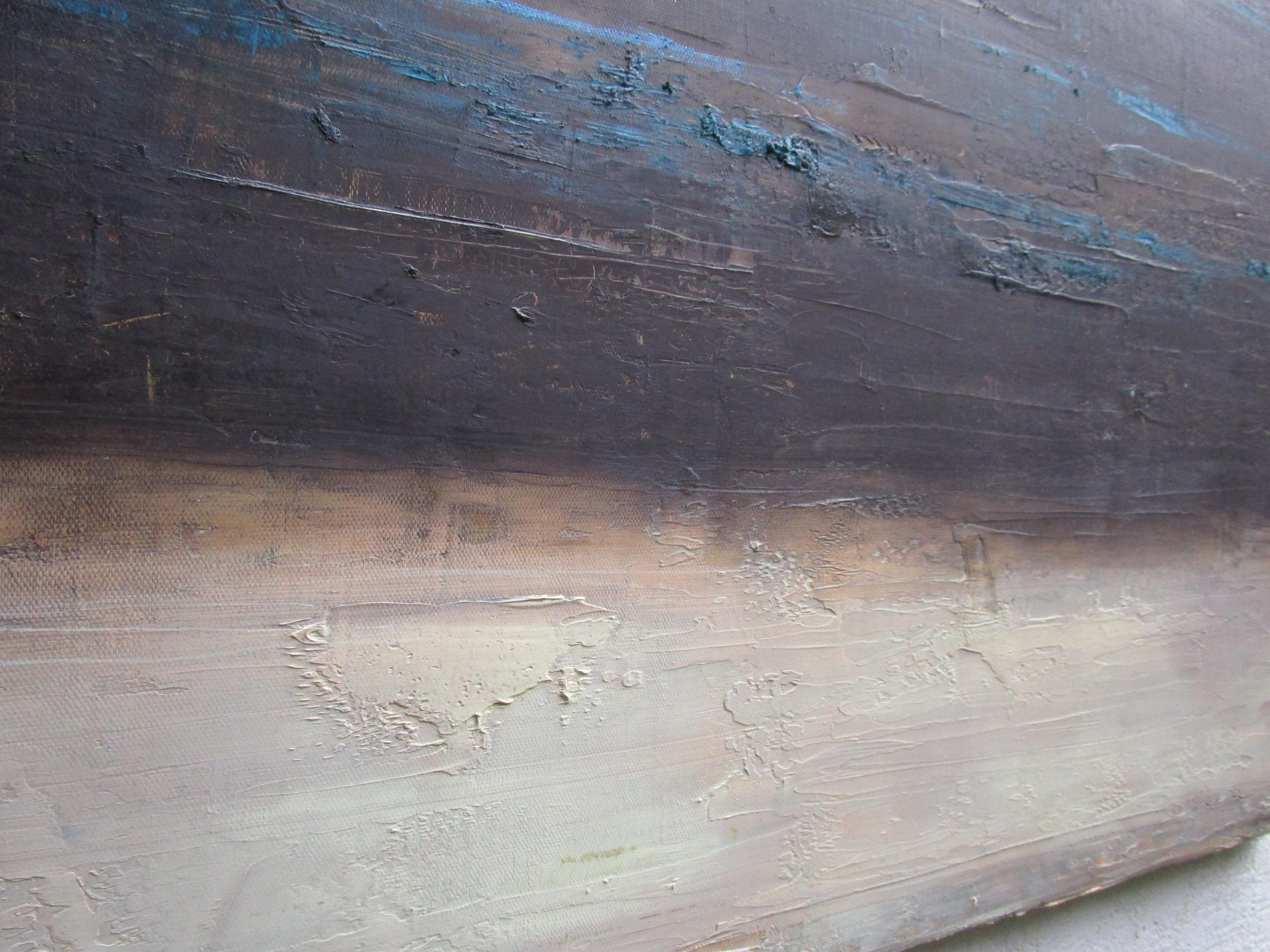 Este óleo sobre lienzo de lino está construido mediante un sofisticado sistema de estratificación horizontal, en el que cada capa establece su propio grado de densidad y tensión visual. Una paleta oscura y profunda forma el campo principal, creando un entorno concentrado en el que se dispersan sutilmente trazos lineales fragmentados de pigmento azul frío. Estas interrupciones cromáticas actúan como impulsos localizados, introduciendo ritmo y vibración interna a la composición, perturbando la homogeneidad tonal y creando una sensación de movimiento discreto.