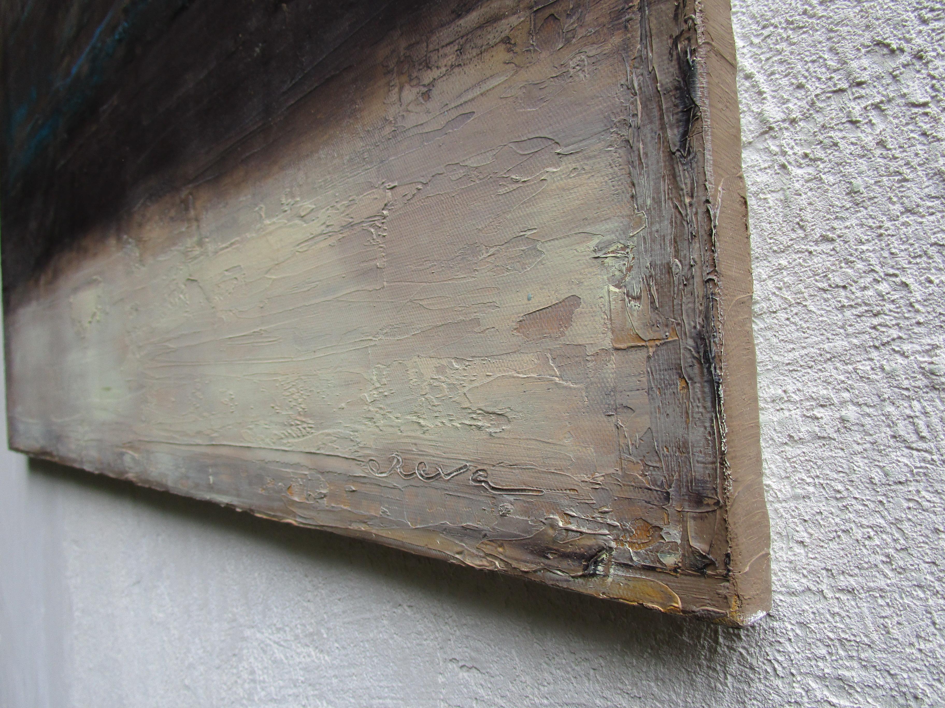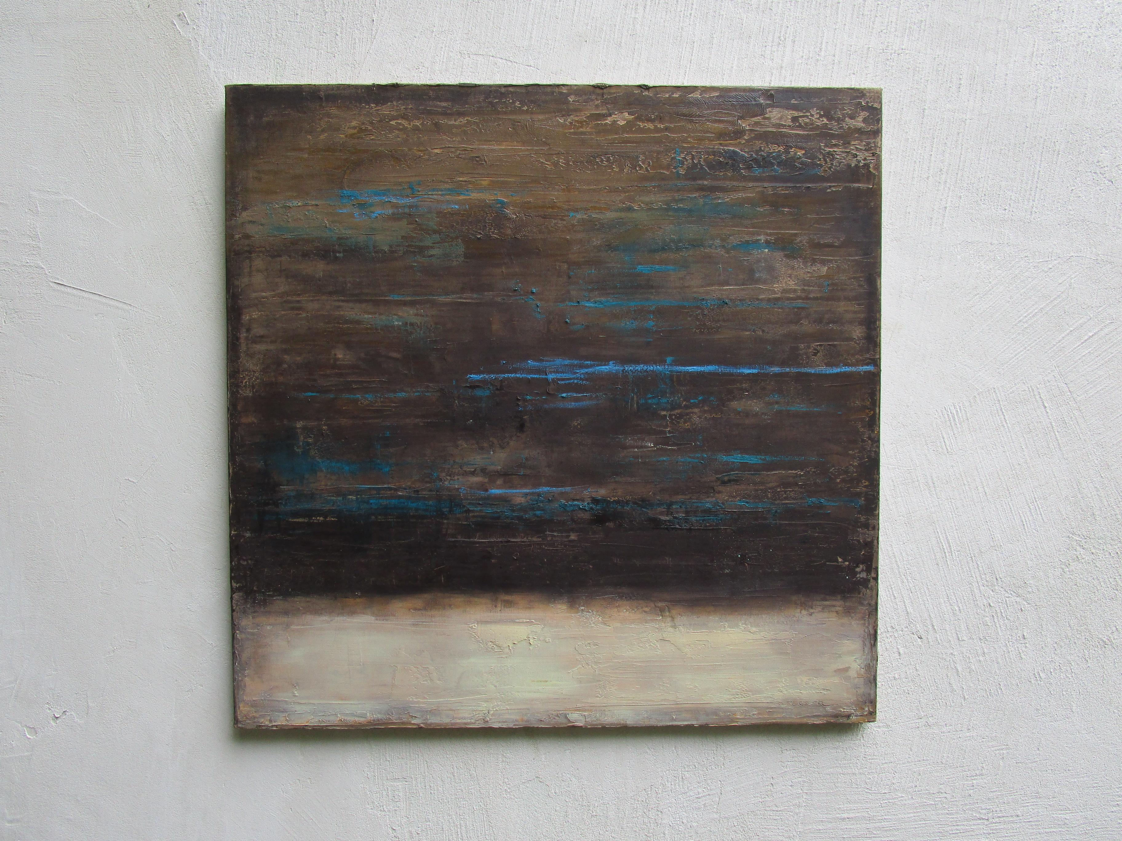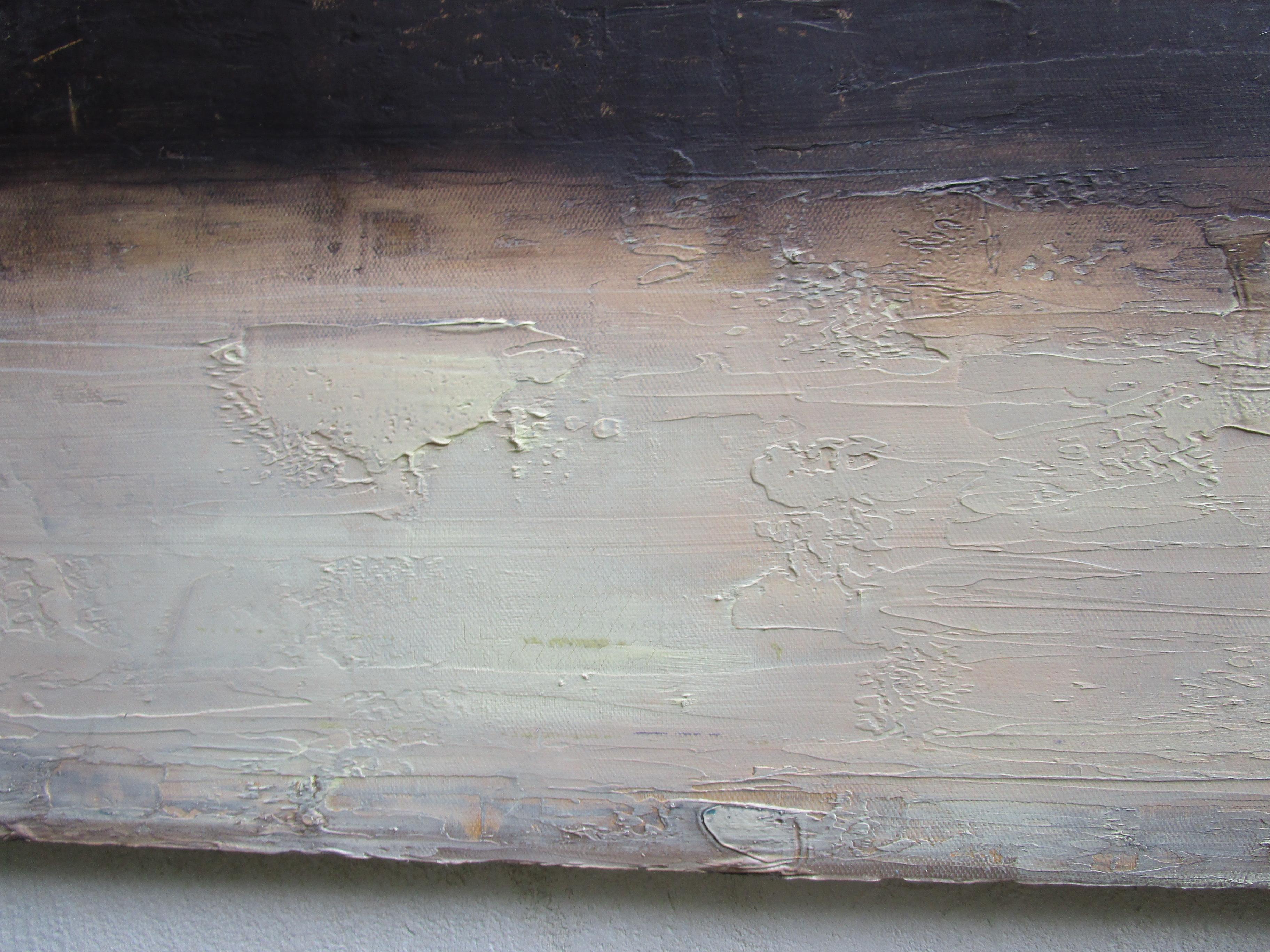 Este óleo sobre lienzo de lino está construido mediante un sofisticado sistema de estratificación horizontal, en el que cada capa establece su propio grado de densidad y tensión visual. Una paleta oscura y profunda forma el campo principal, creando un entorno concentrado en el que se dispersan sutilmente trazos lineales fragmentados de pigmento azul frío. Estas interrupciones cromáticas actúan como impulsos localizados, introduciendo ritmo y vibración interna a la composición, perturbando la homogeneidad tonal y creando una sensación de movimiento discreto.