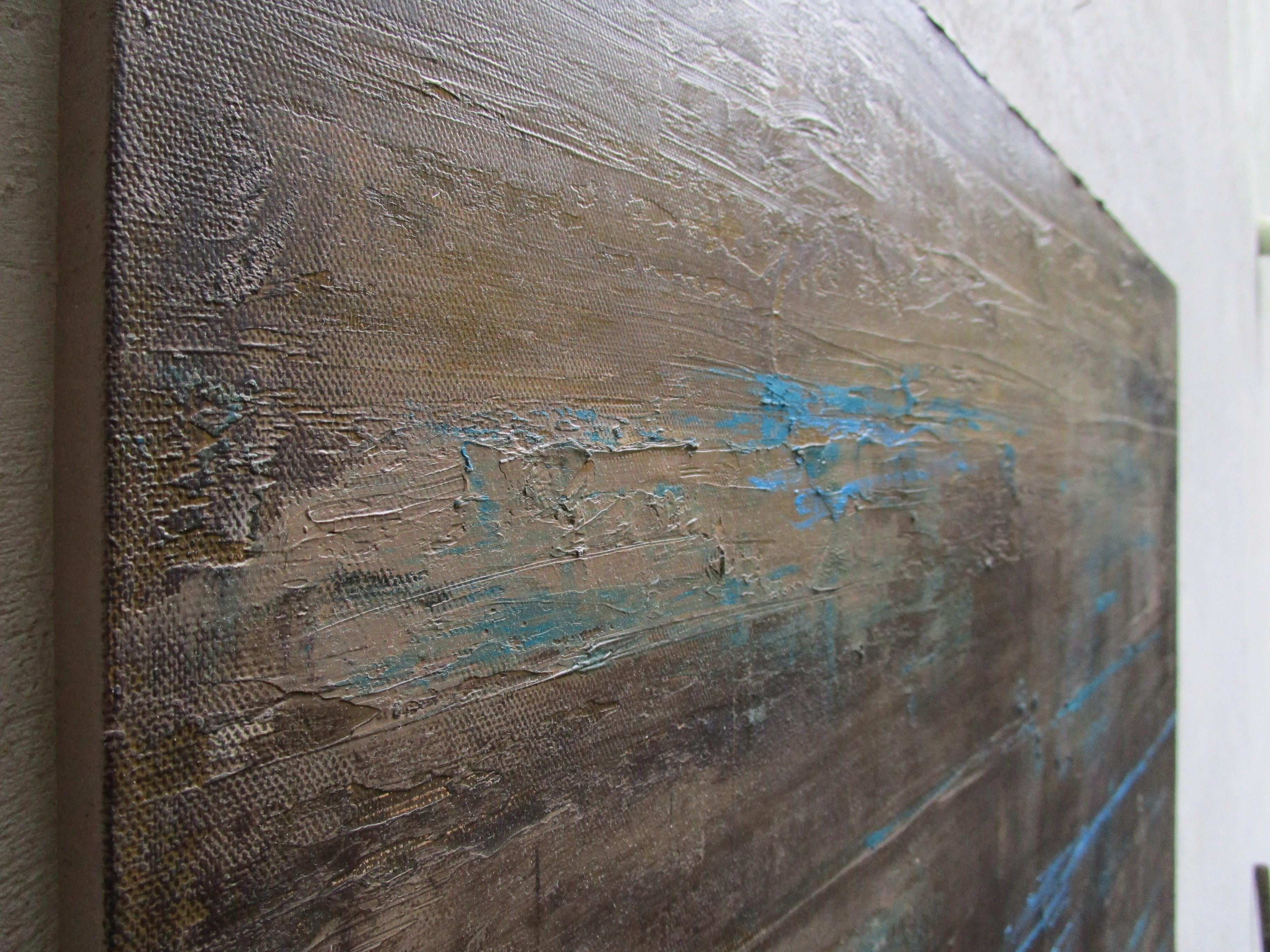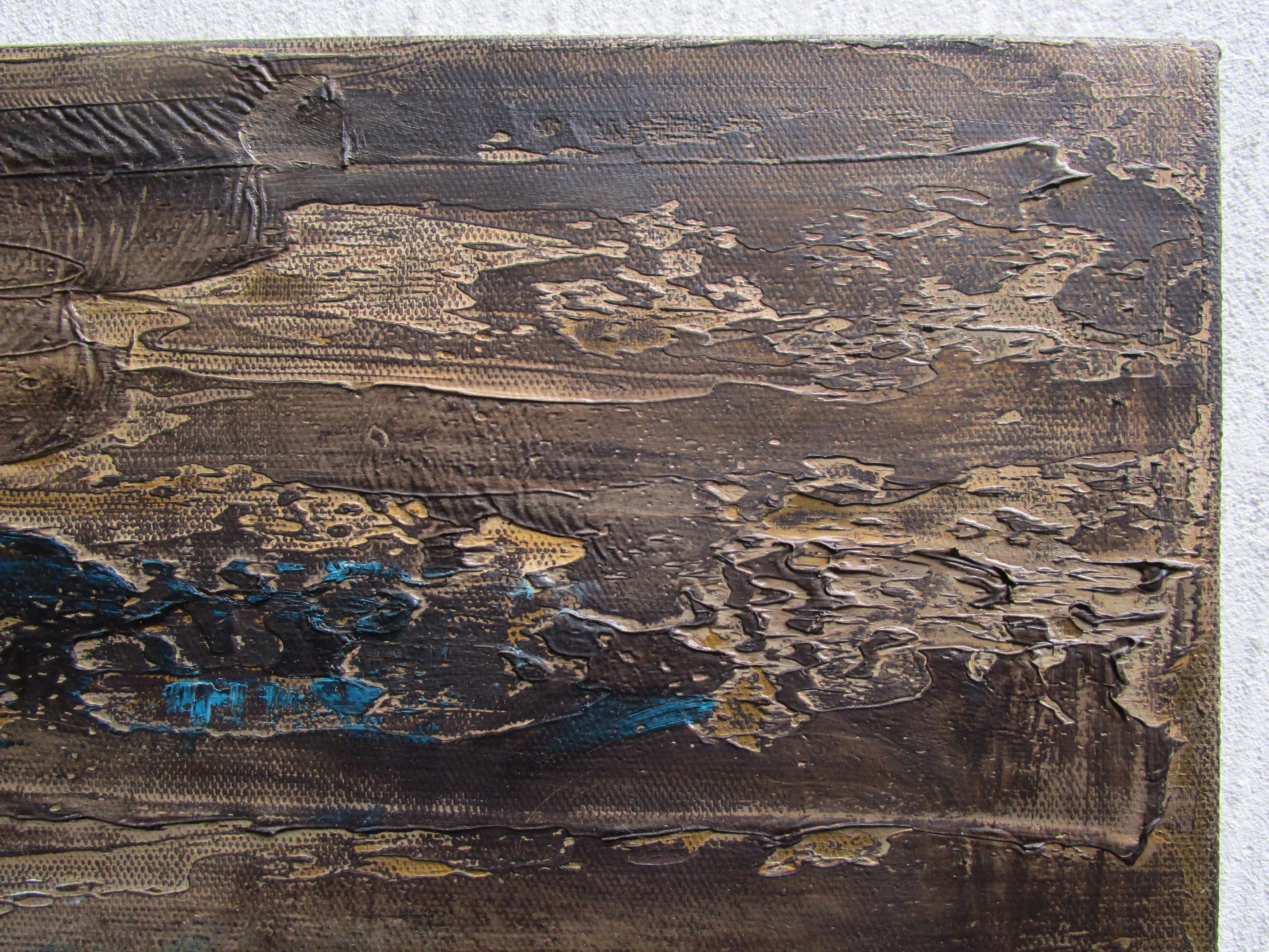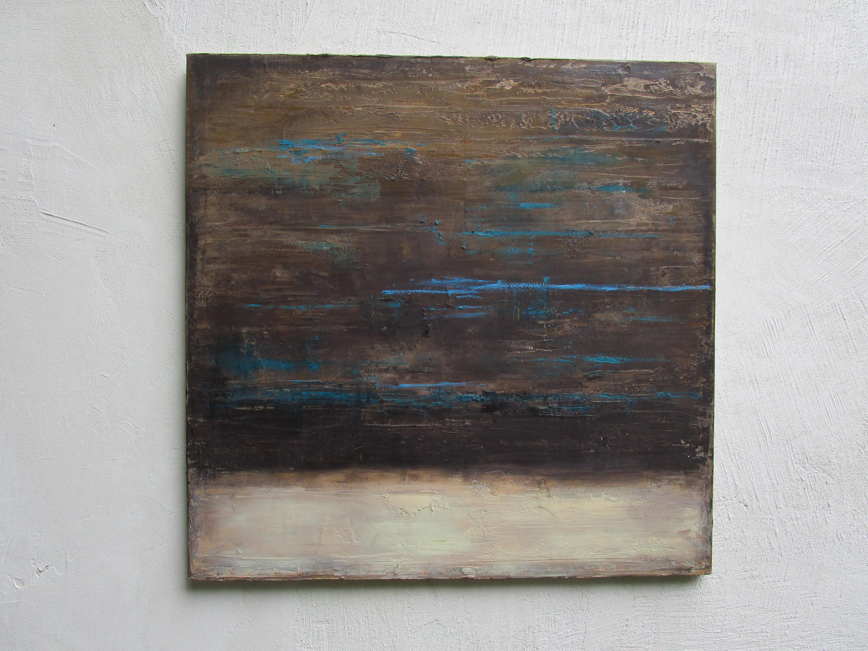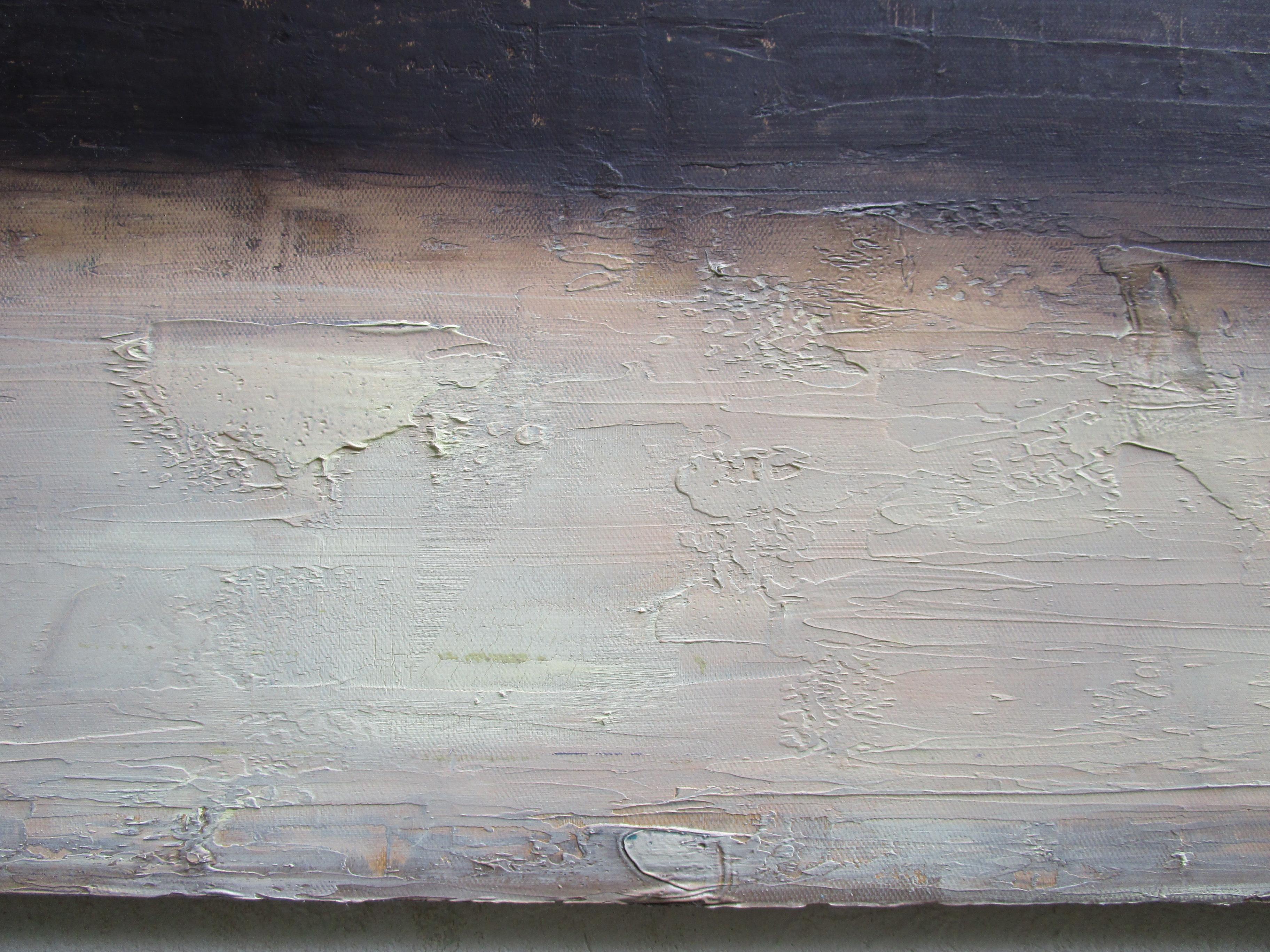 Este óleo sobre lienzo de lino está construido mediante un sofisticado sistema de estratificación horizontal, en el que cada capa establece su propio grado de densidad y tensión visual. Una paleta oscura y profunda forma el campo principal, creando un entorno concentrado en el que se dispersan sutilmente trazos lineales fragmentados de pigmento azul frío. Estas interrupciones cromáticas actúan como impulsos localizados, introduciendo ritmo y vibración interna a la composición, perturbando la homogeneidad tonal y creando una sensación de movimiento discreto.