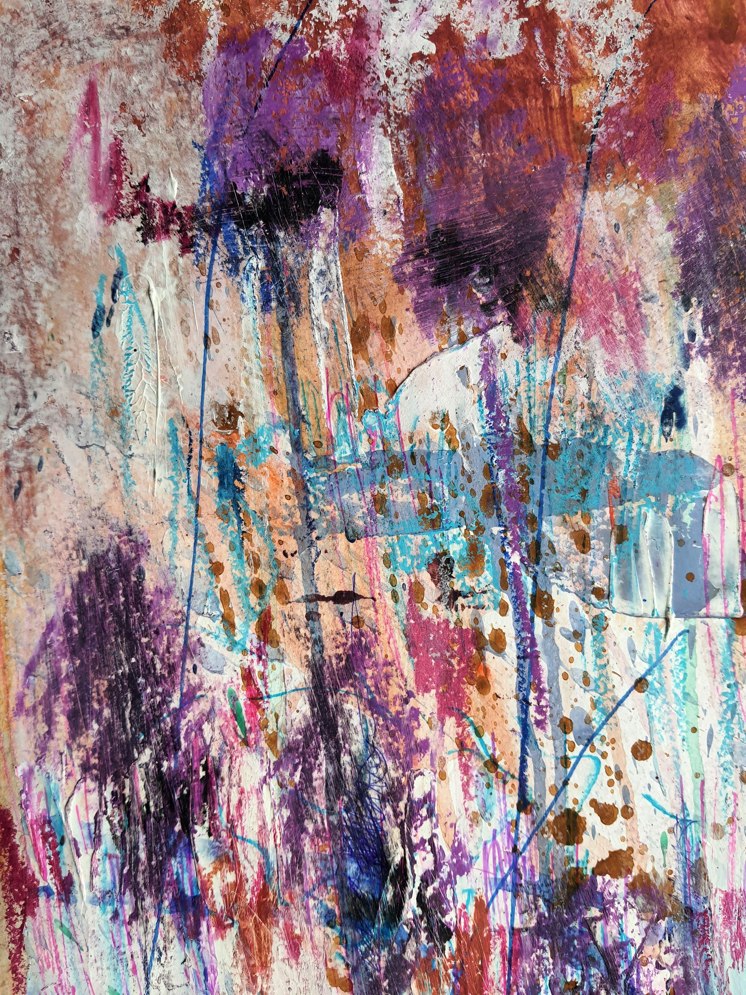 Estado de ánimo floral 5. Ramo de lilas: flores rosas, moradas y blancas sobre un fondo abstracto, creado con pinceles y una espátula. La imagen está llena de energía positiva y sola...
