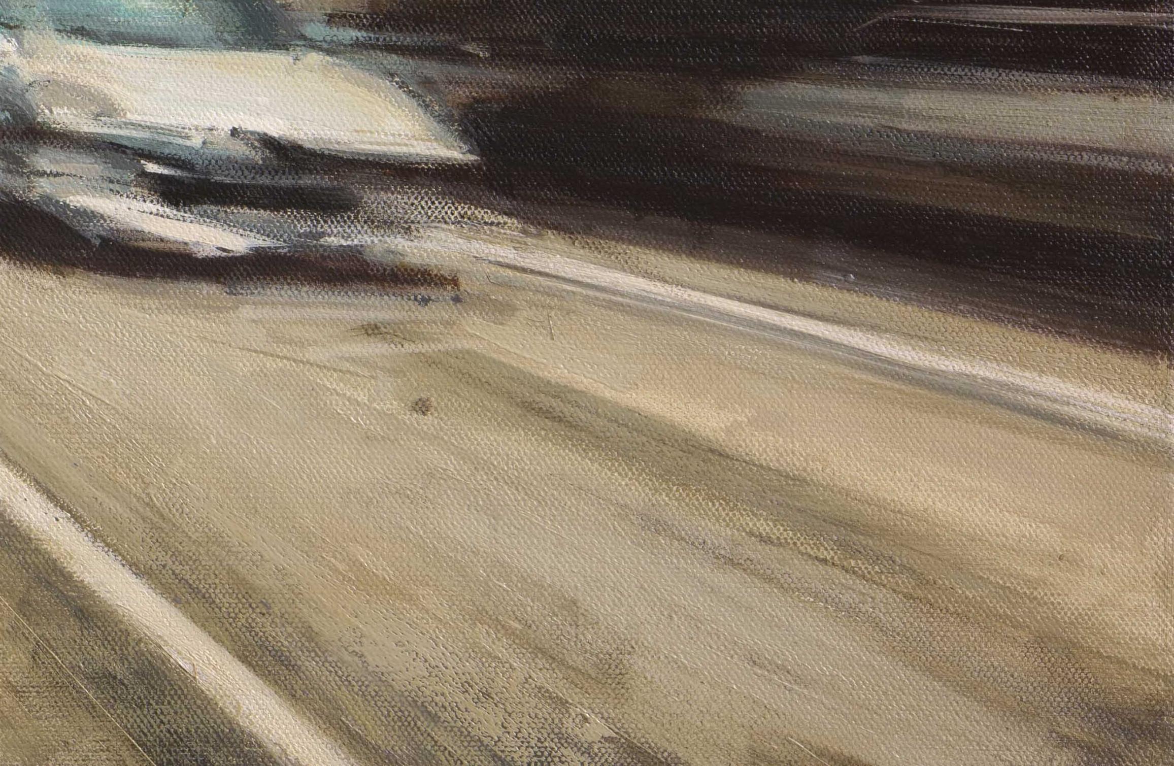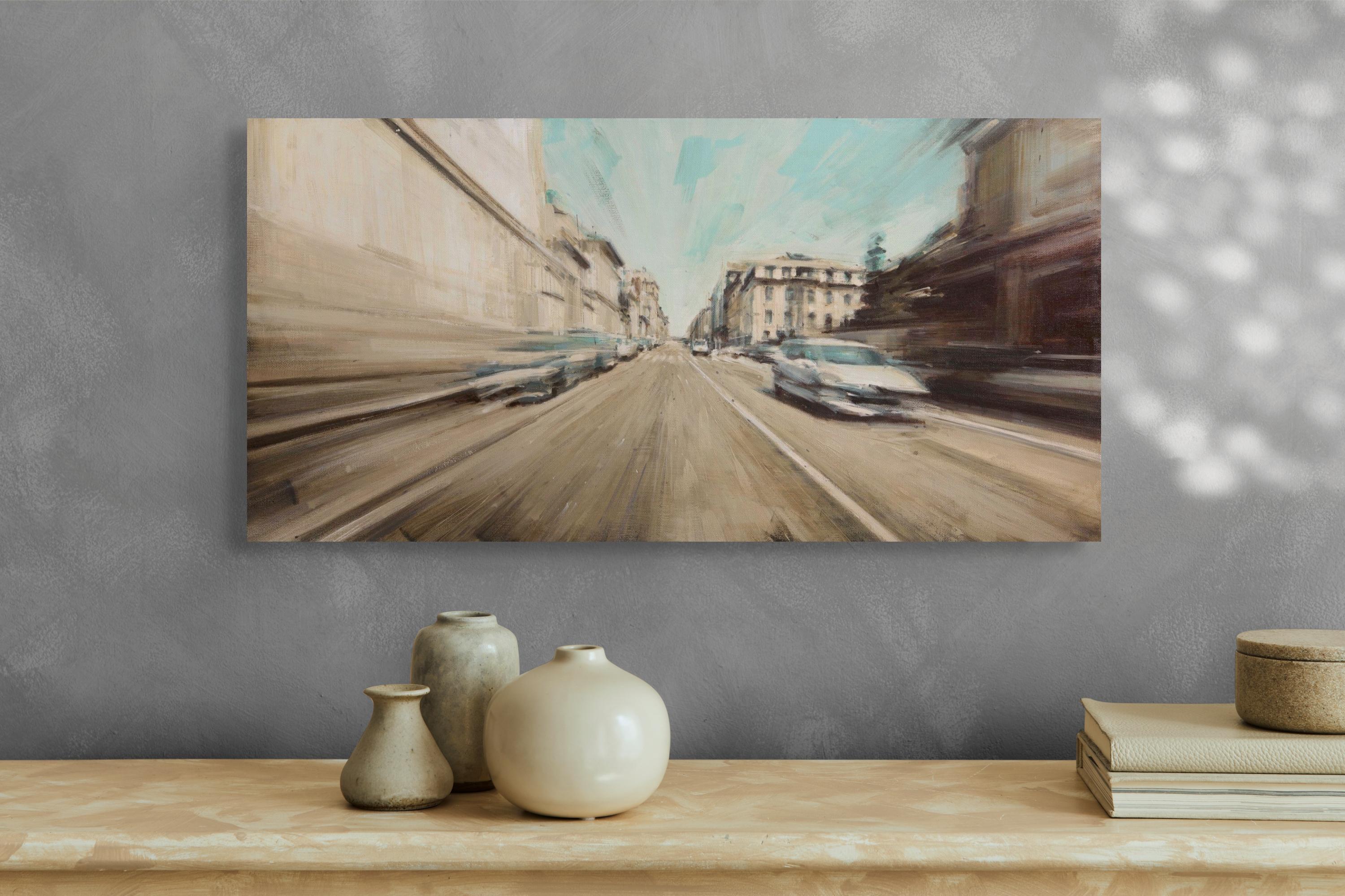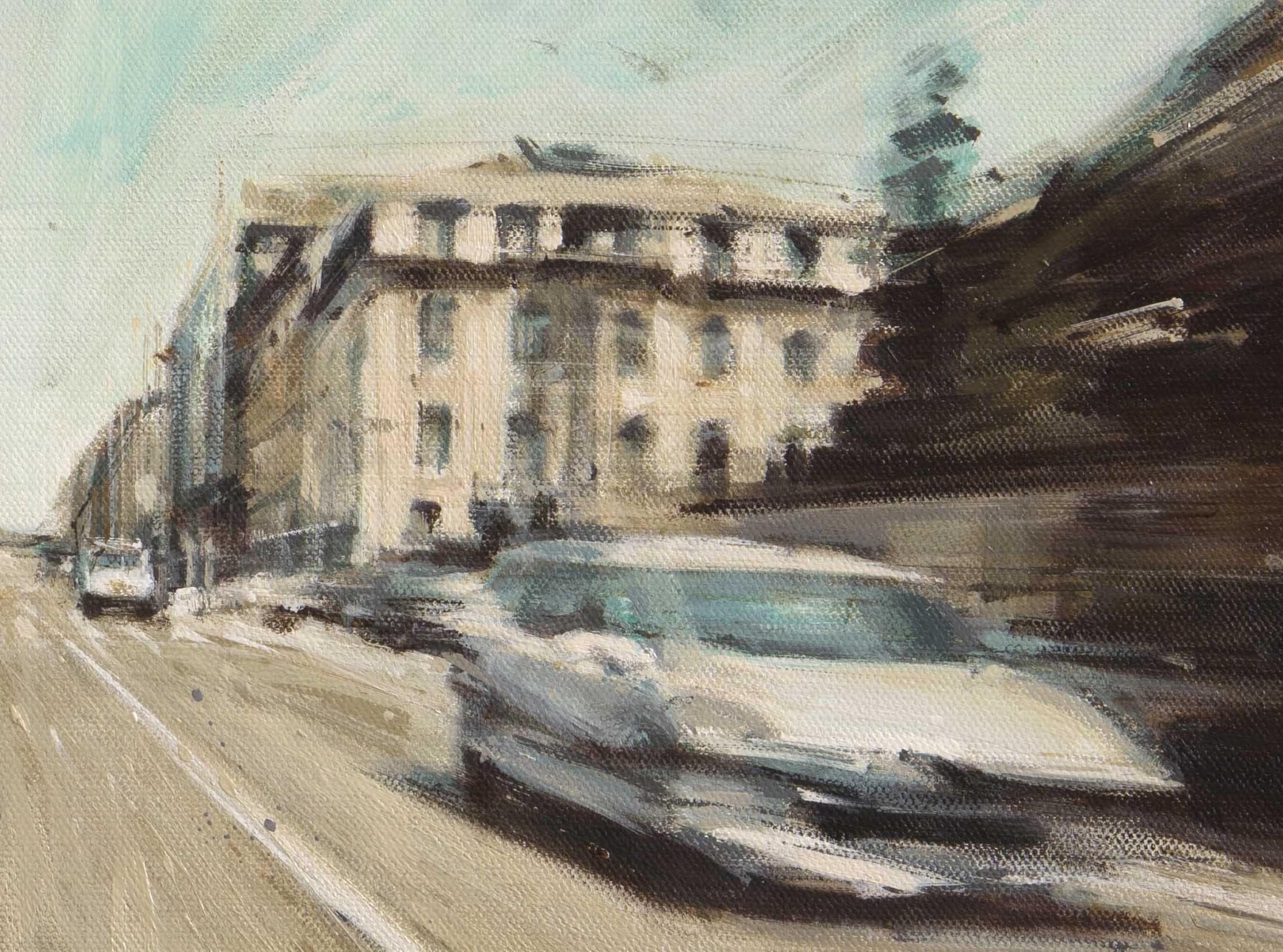 "Zip Zoom Zoey" (2022) de Mikael Olson, pintura impresionista al óleo de paisajes urbanos