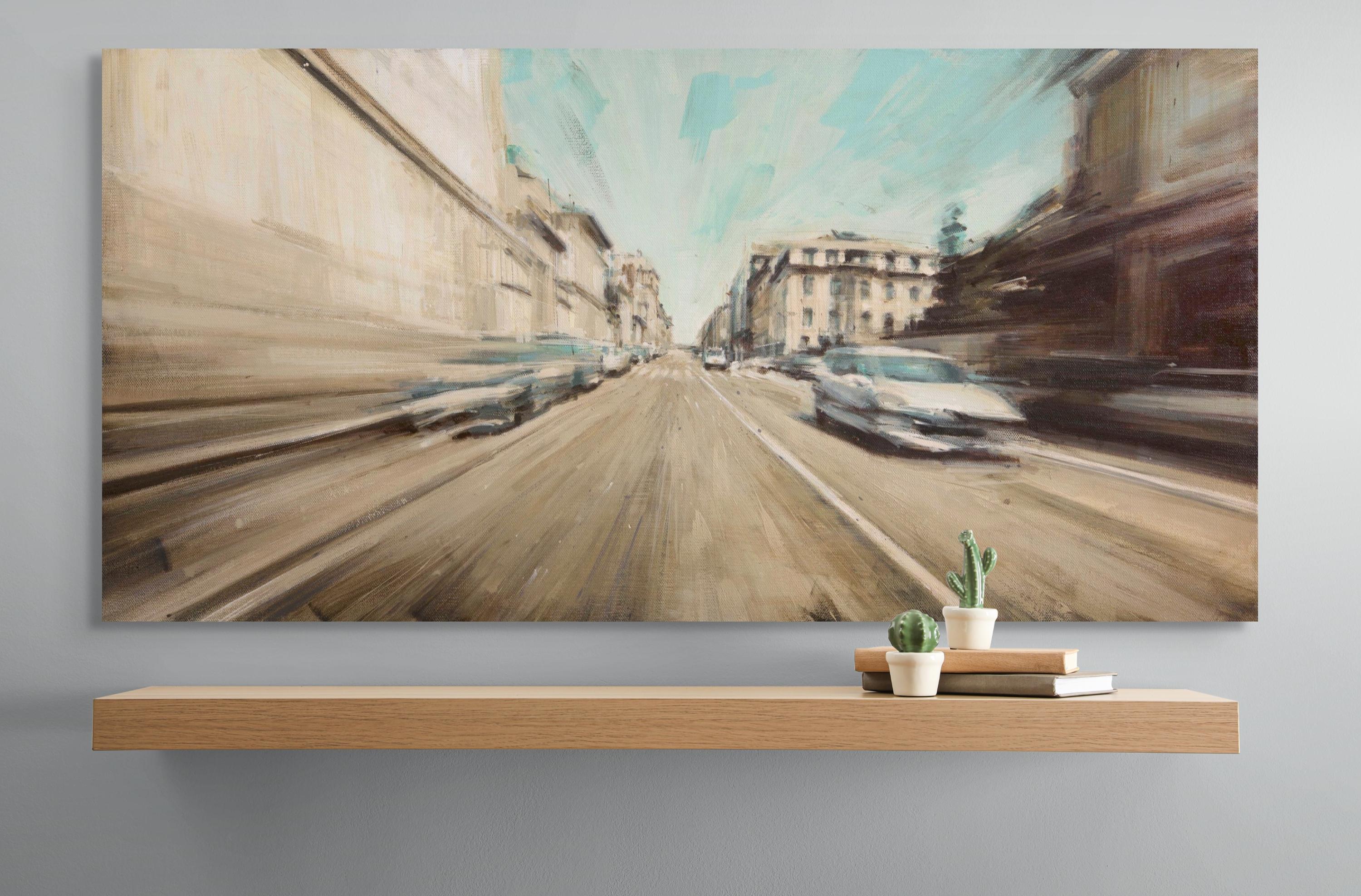 "Clave alta" (2022) de Mikael Olson, pintura al óleo impresionista de paisaje urbano
