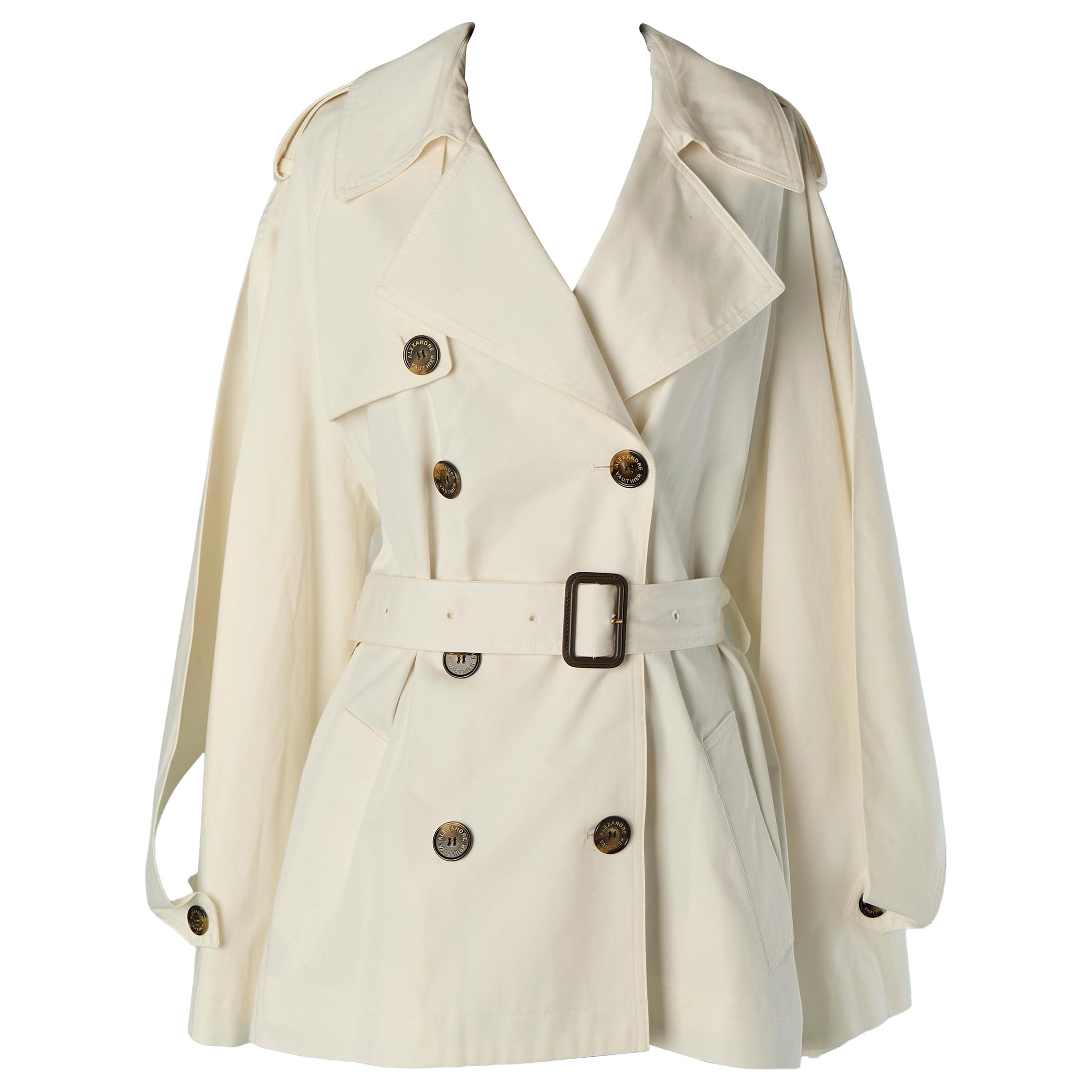 Chaqueta trenca de organza marrón con doble botonadura. Botón con la marca y cierre de ojal en la parte delantera y en los puños. Bolsillo en ambos lados. Cinturón con cierre de hebi...