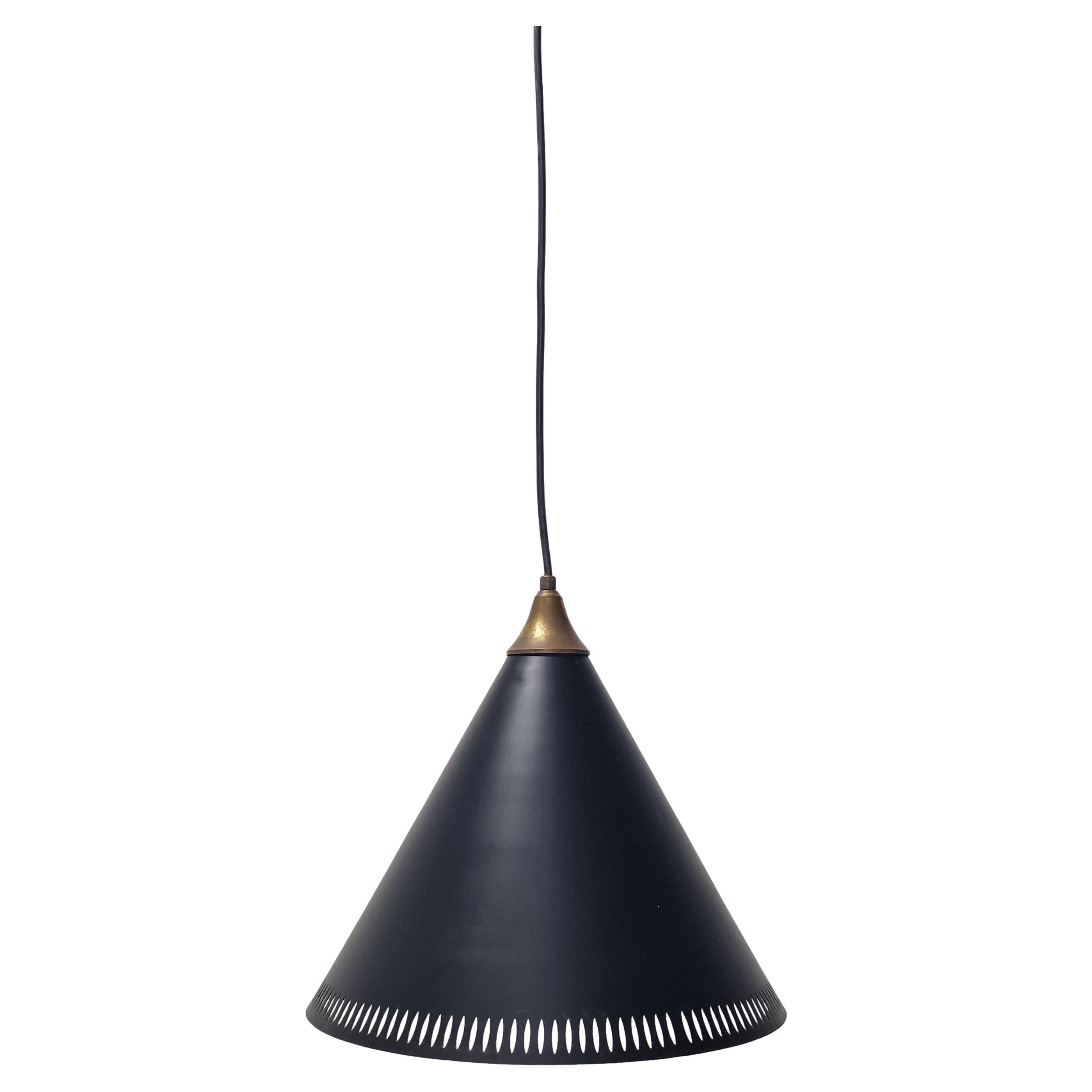 Colgante de latón, lacado en negro y cristal opalino diseñado por Bent Karlby y producido por Lyfa, Dinamarca, años 50. La pantalla muestra estrellas perforadas y el cristal está suj...