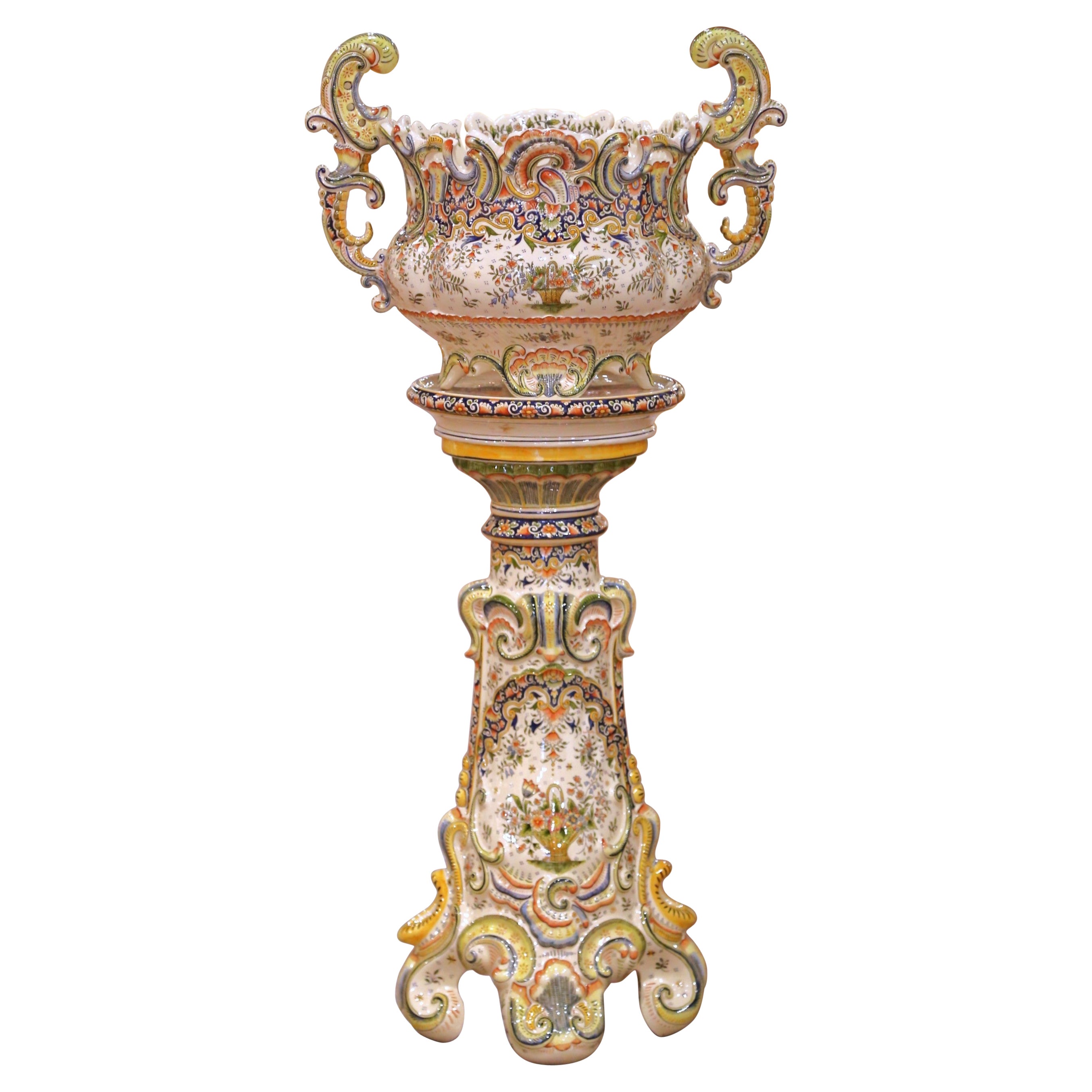 Esta impresionante jardinera antigua de loza francesa de principios del siglo XX con pedestal, de hacia 1920, se fabricó en Desvres, uno de los centros más importantes de Francia de ...