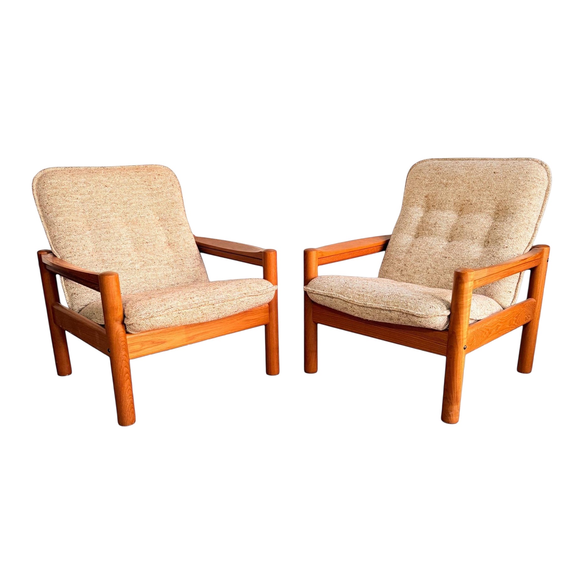 Presentamos un juego completo de dos tumbonas de respaldo alto de fabricación danesa con taburetes para los pies. Fabricado a mediados de la década de 1970 por el elogiado Domino Møb...